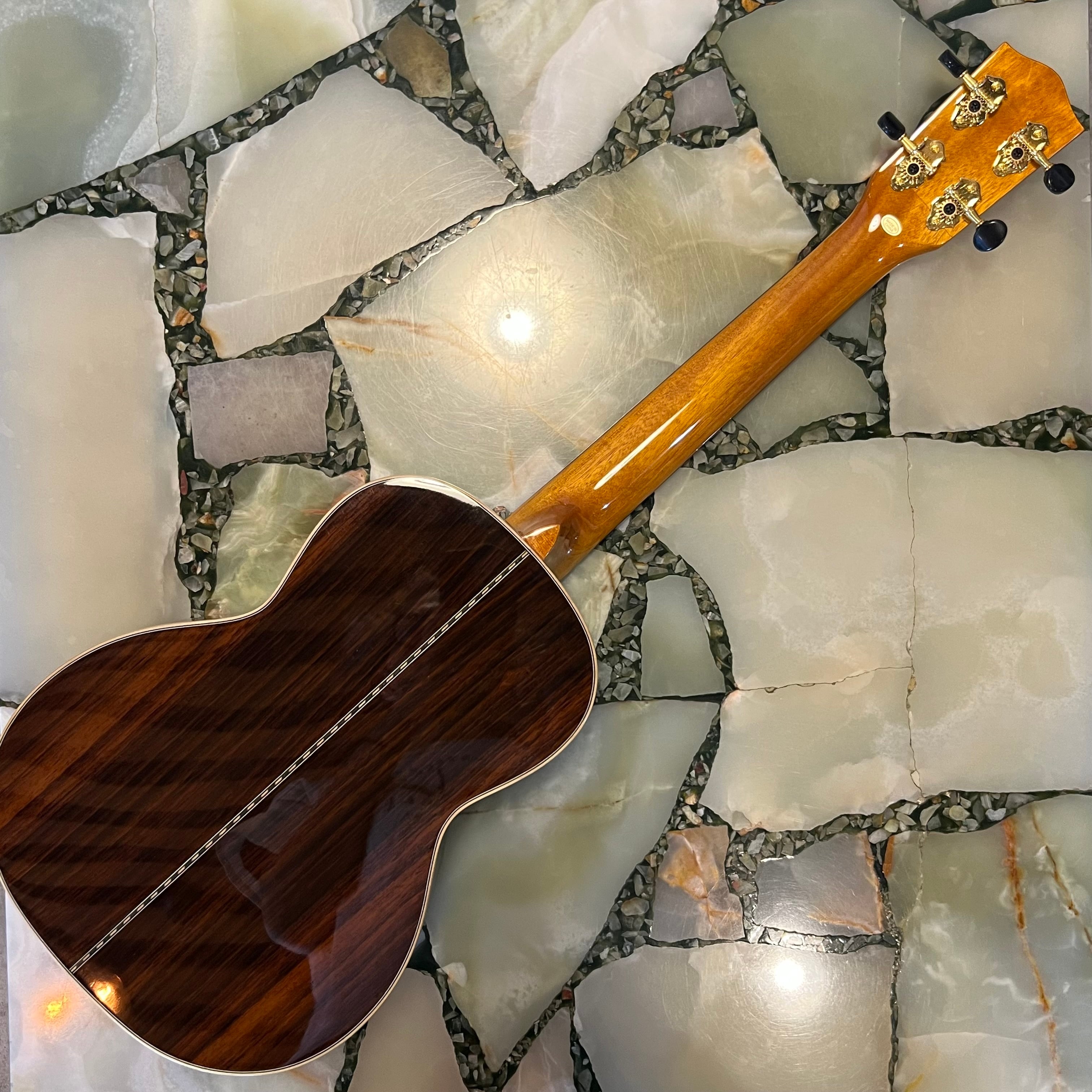 こちらのTK-42は、ボディー・トップには長年湖や川の底に沈んでいたウェスト・コースト・シンカー・レッドウッド単板、サイドとバックにリッチなローズウッド単板を使用した、431.8mm スケールのテナー・サイズの限定モデルです。こちらが国内に残っている最後の1本です!