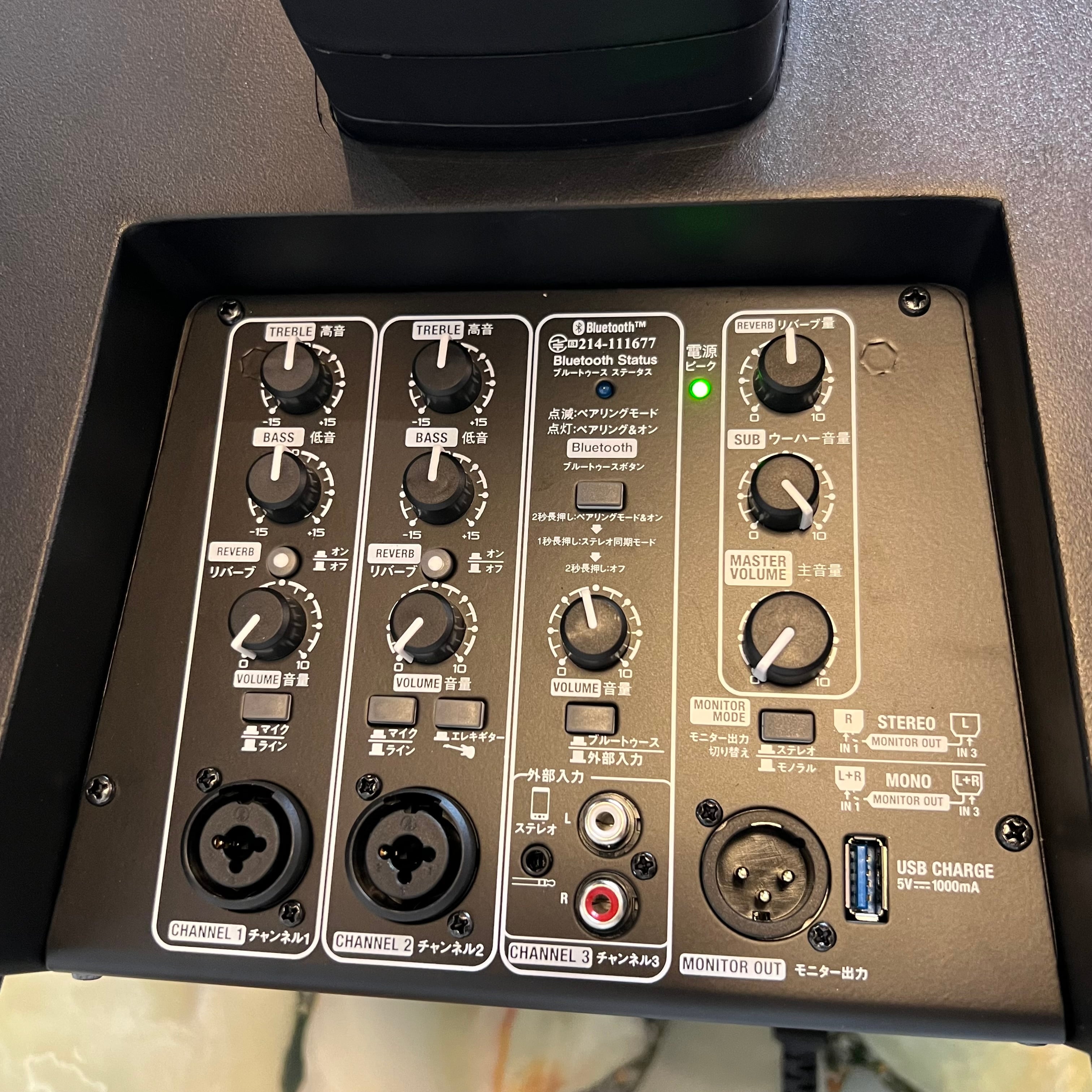 コントロール:主音量(MASTER VOLUME),CHANNEL 1,2 VOLUME(チャンネル1,2音量),ラインマイク切り替え、Bluetooth VOLUME(音量),TREBLE BASS EQ(高音、低音) SUB(ウーハー音量) REVERB(リバーブ量)