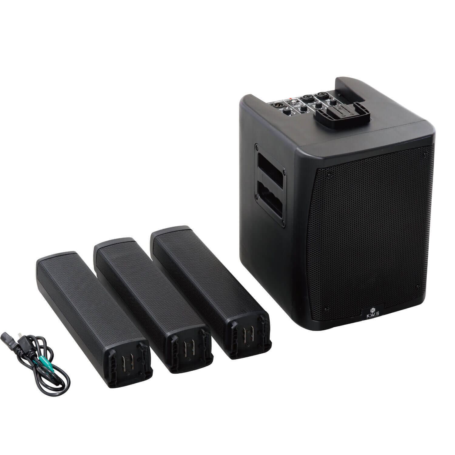 また、2 台シンクロで使用可能で、カフェほどの広さの中規模会場もカバー。モニター出力切り替え機能によりステレオ、モノラルいずれでも使用可能です。また、Bluetooth対応で、スマートフォンなどを繋いで音楽をかけることも可能です。さらに、スマートフォンなどの充電用のUSB電源端子を装備しているので、音源の充電切れなどの心配もありません。また、コラムスピーカー部は1~3台で自由に数を決められるので、高さが出せない時などにも便利にご利用いただけます。