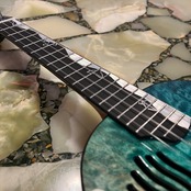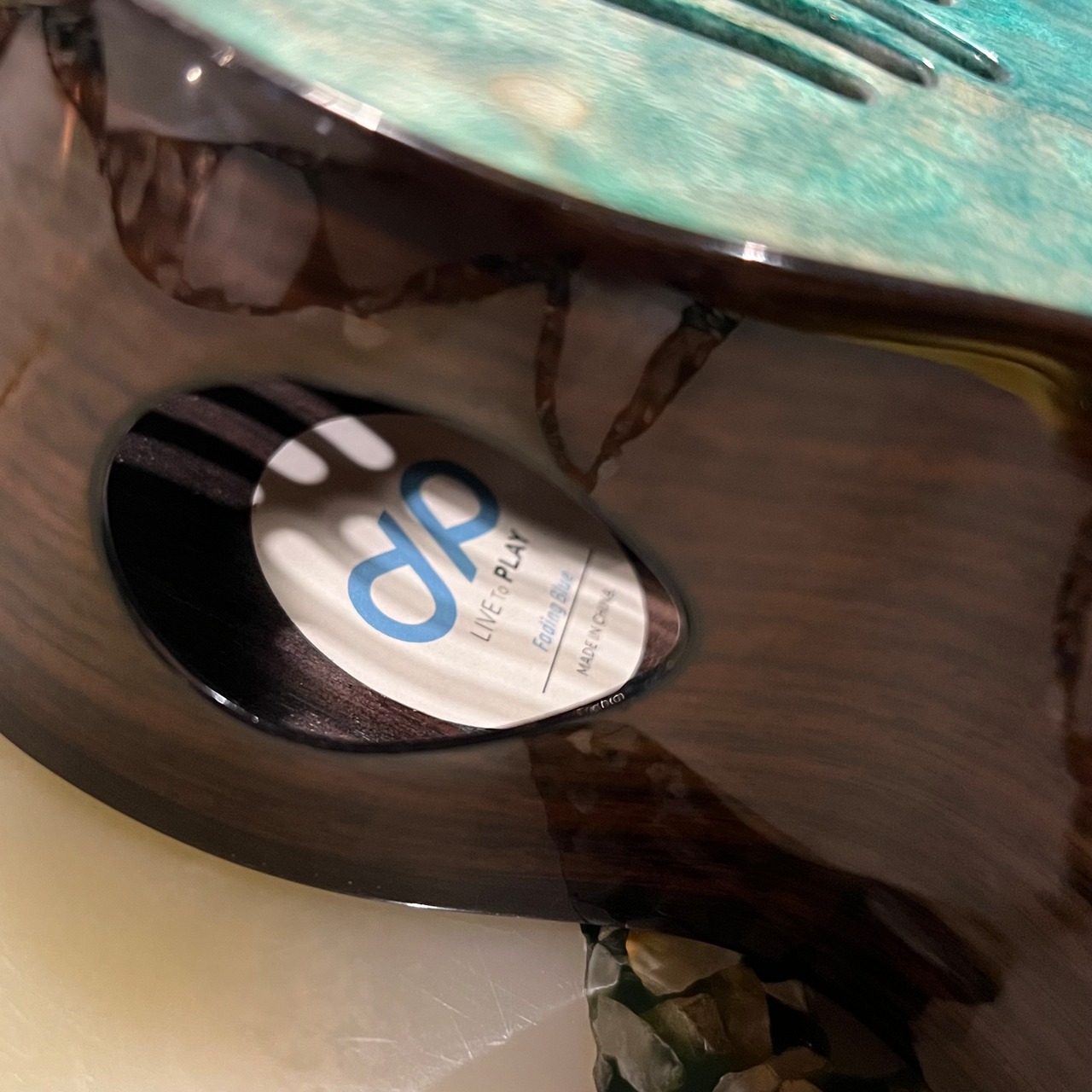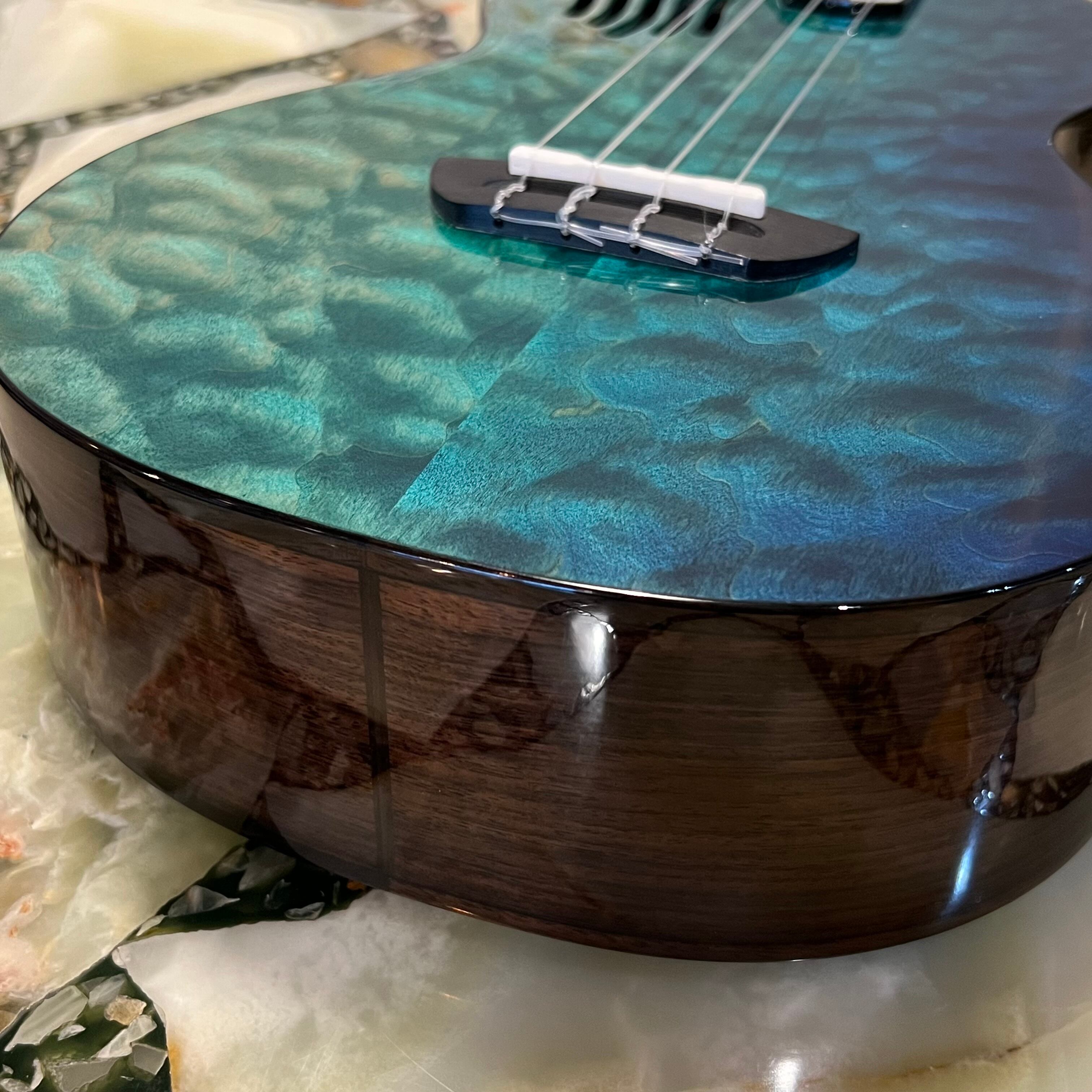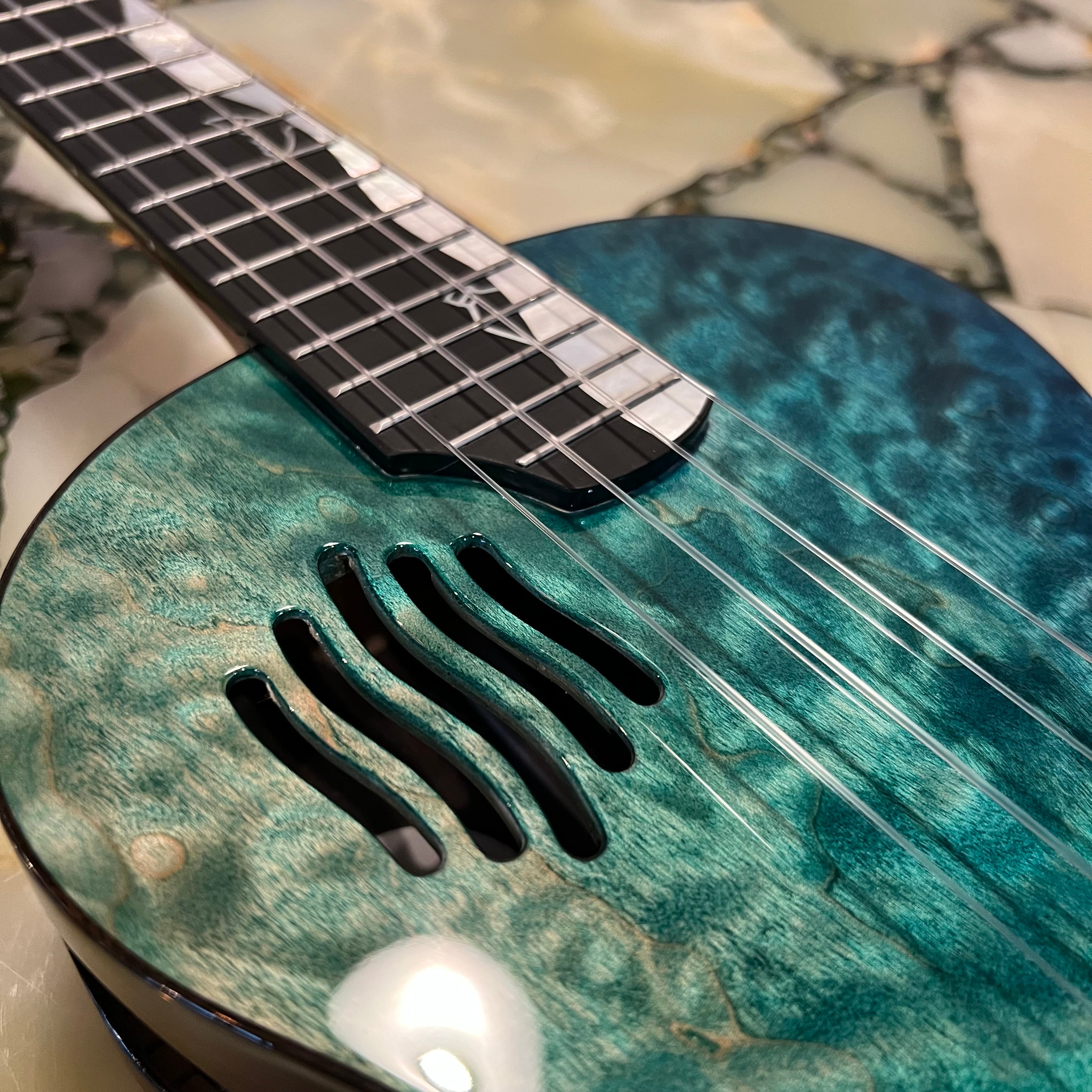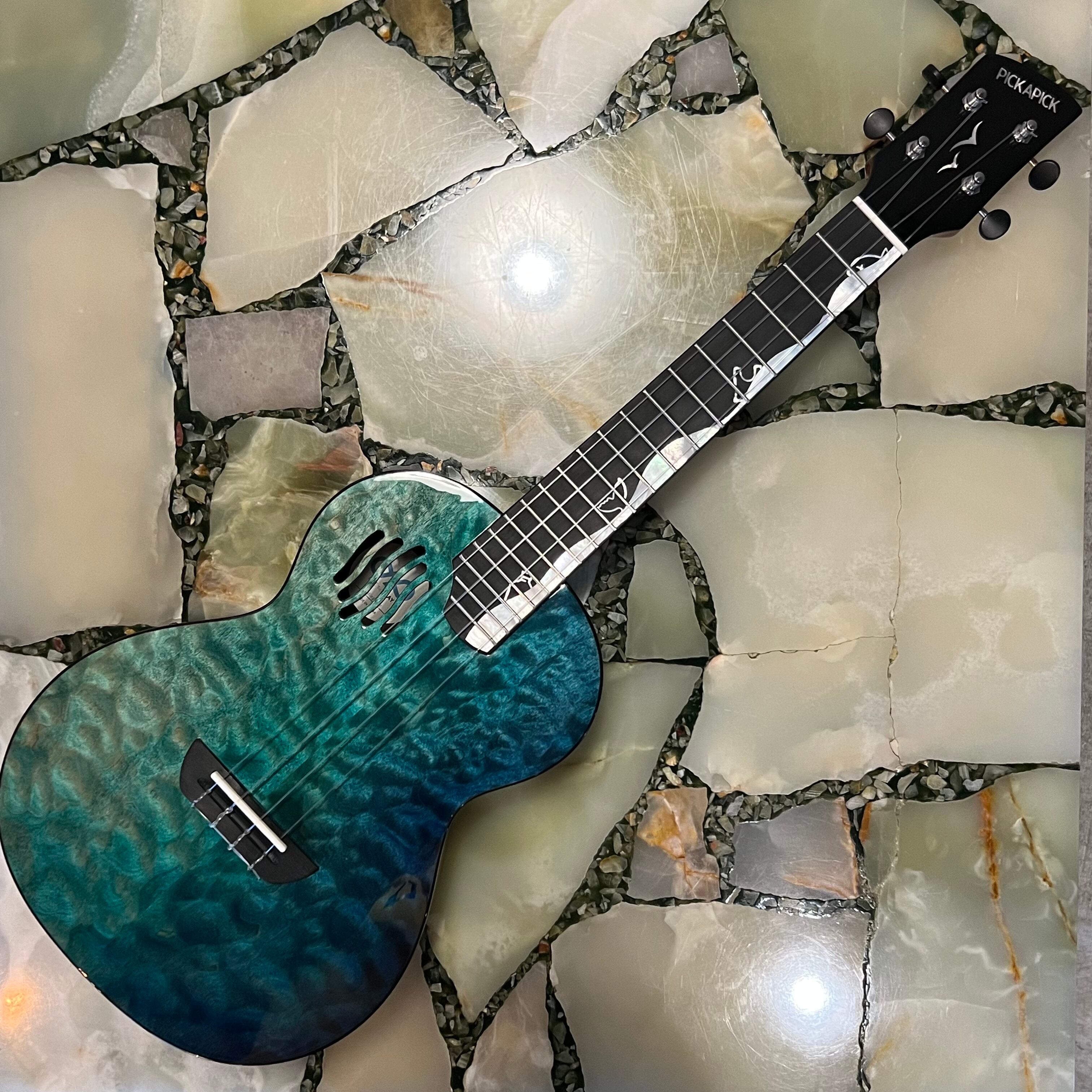 種類は安価なモデルからハイエンドなモデルまで展開をしていますが、こちらのモデルはPICKAPICKの中でも最上位機種で、スカイブルーの波模様をトップに製作されたテナーモデルでありズバり海を表現しています。メイプルの杢目を実にうまく利用したデザインとなっています。そして指板にかけて海の波を貝で贅沢に表現しています。そして、コンセプトとなるこちらのモデルは環境保護。クジラのしっぽなどと一緒にゴミもあったり、海の中ではみんな一緒に海なんだ。ゴミNGをダイレクトに表現している。大切なメッセージも込めたウクレレになっています。