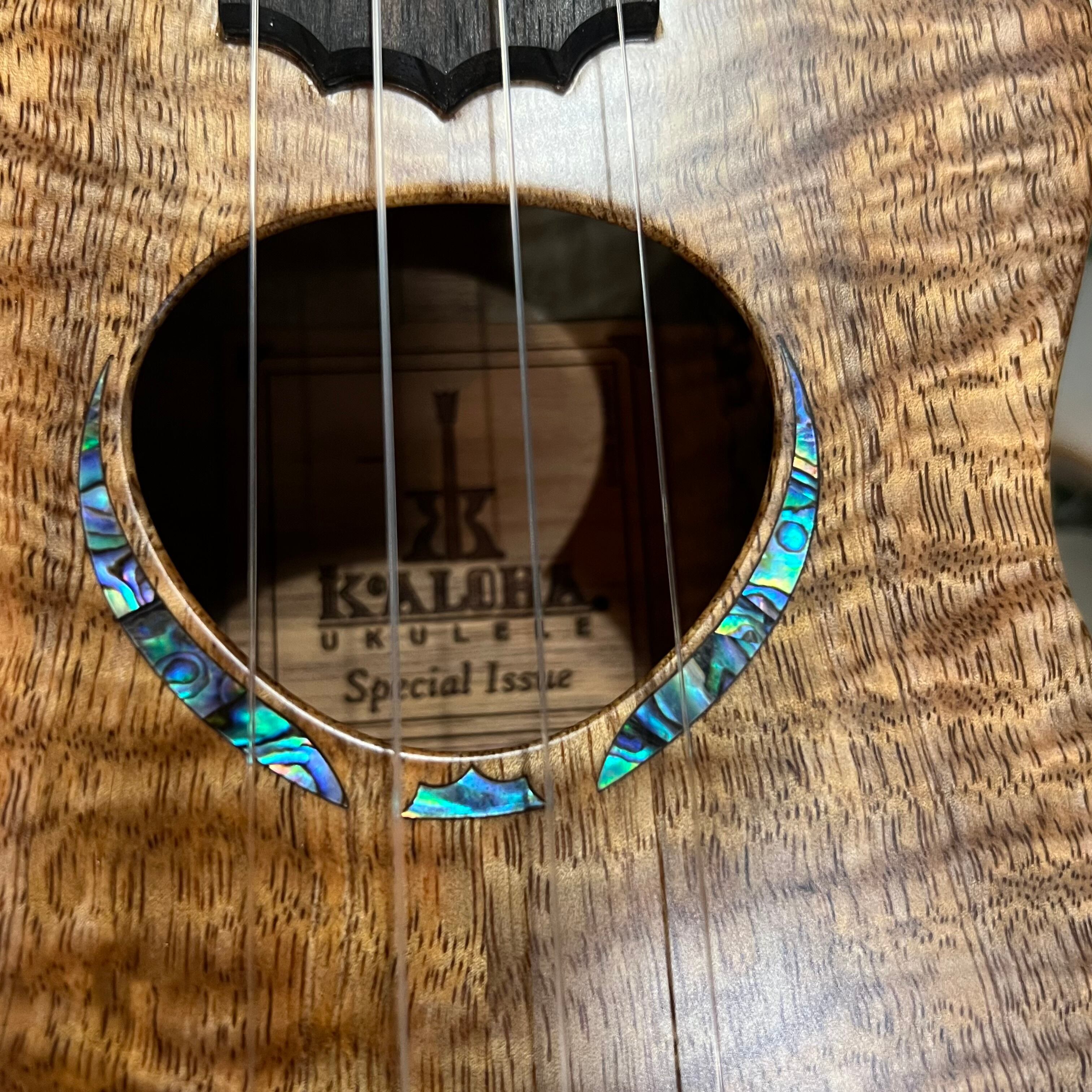 木材は選りすぐった極上の木目のハワイアンマンゴー材を使用し、サウンドホールの周りにはアバロン貝で特別なインレイを施してもらってます。