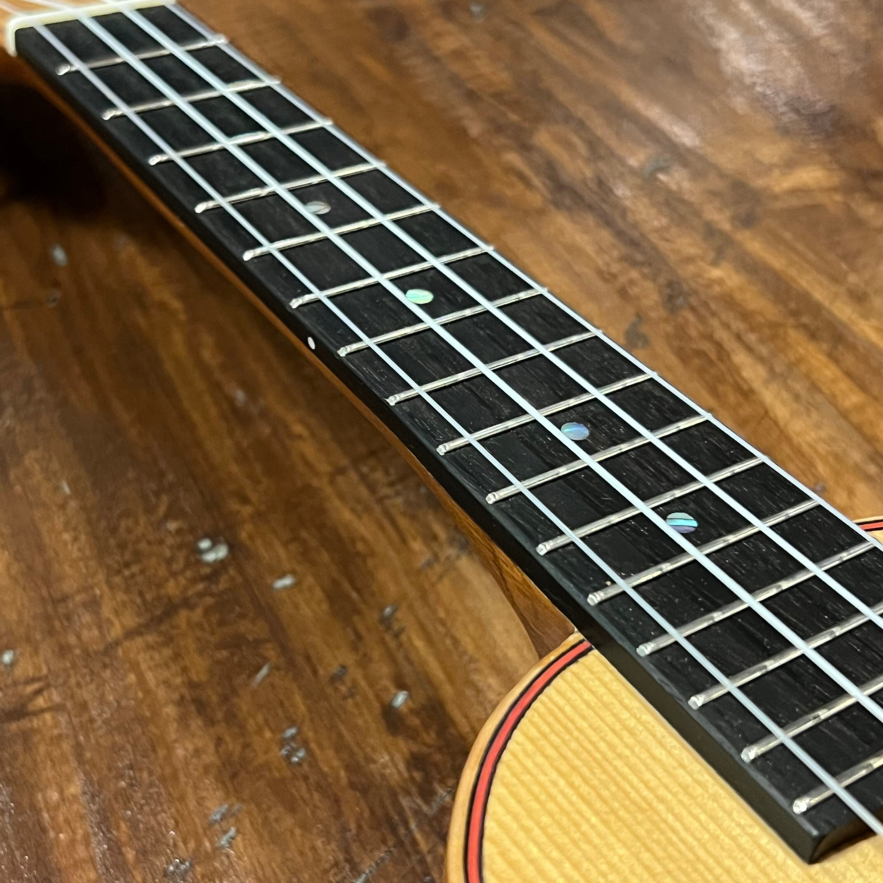 ソリッドレッドシダートップ、ソリッドマホガニーサイドバック、アマラエボニー指板とブリッジを使用し、素早いレスポンスと深みのあるサウンドを実現。