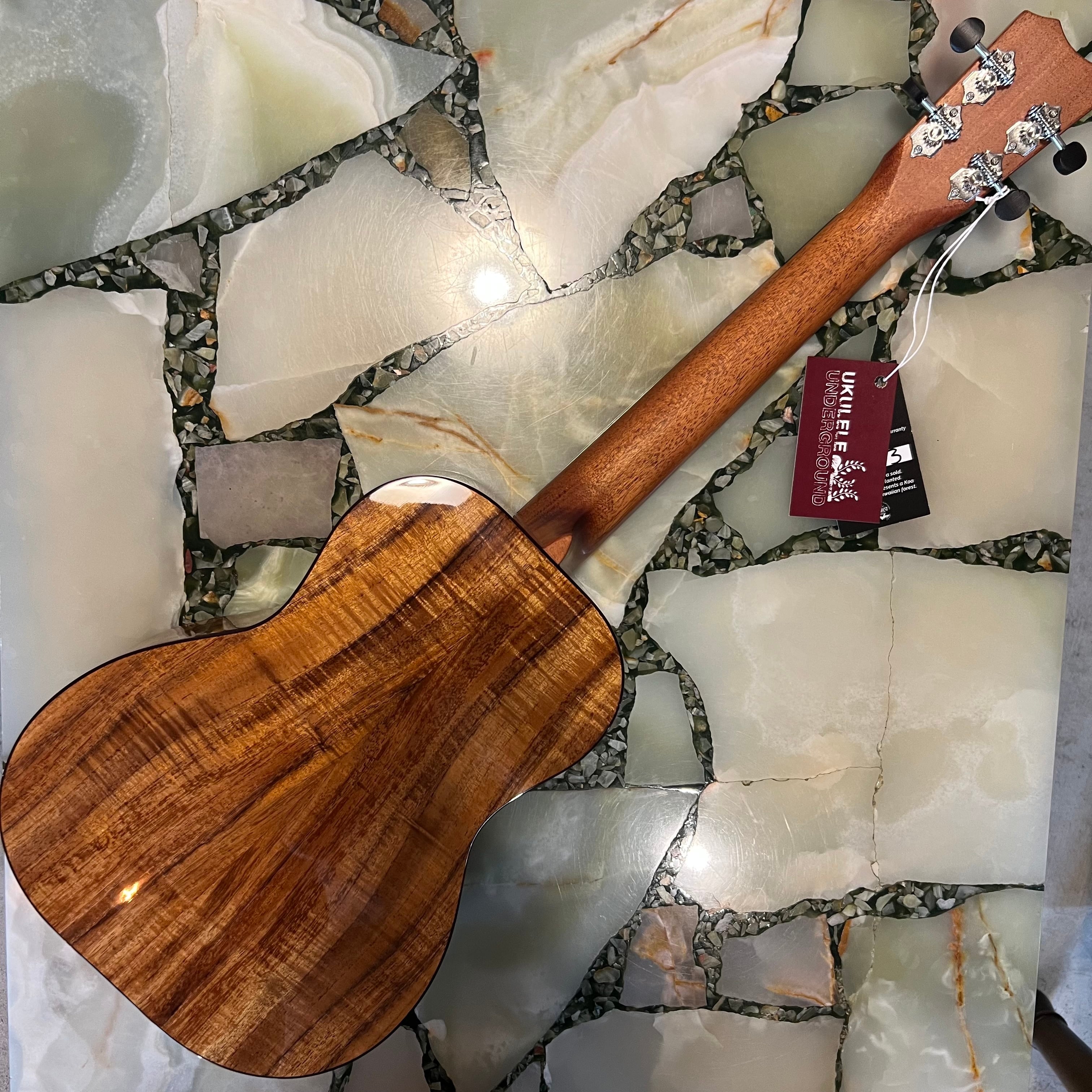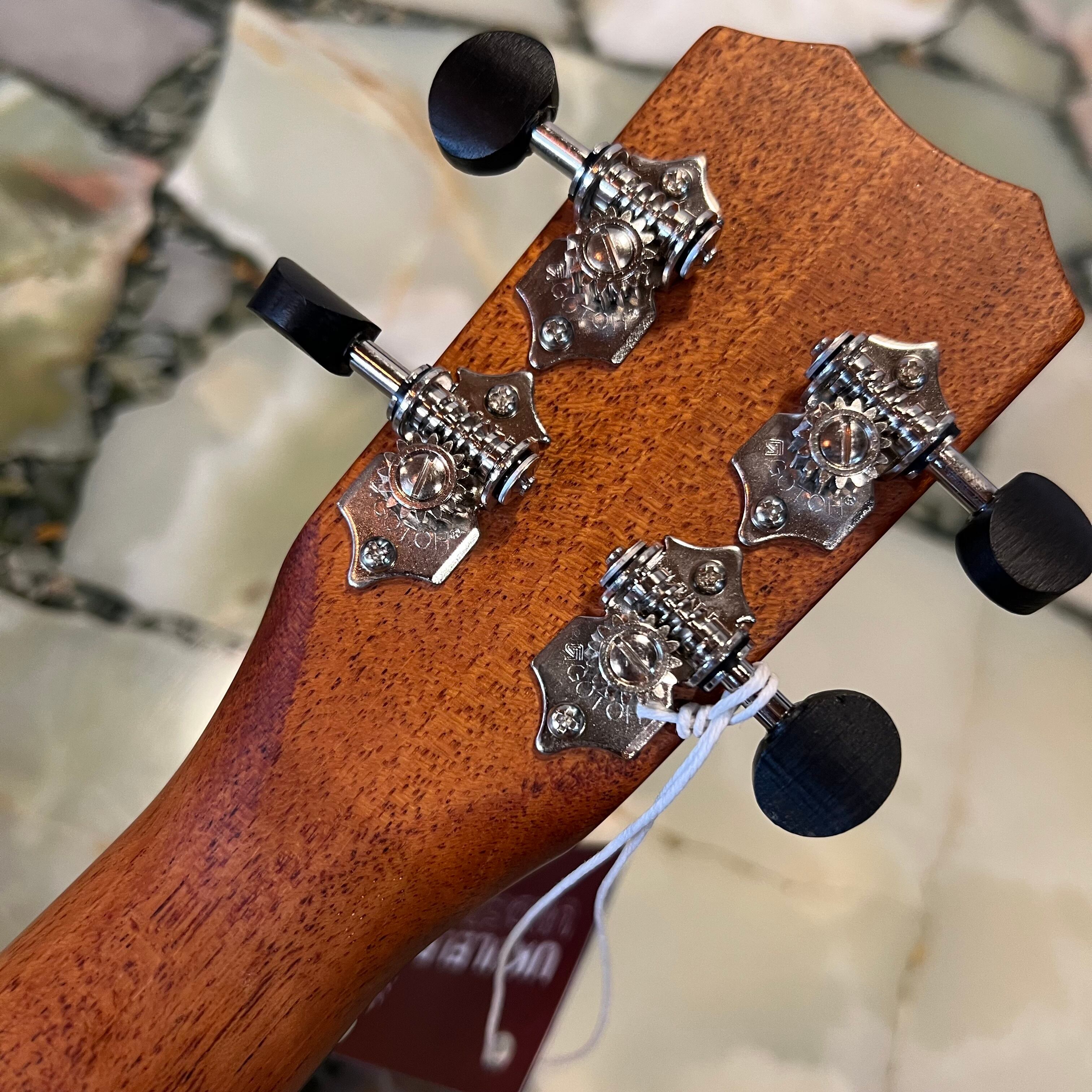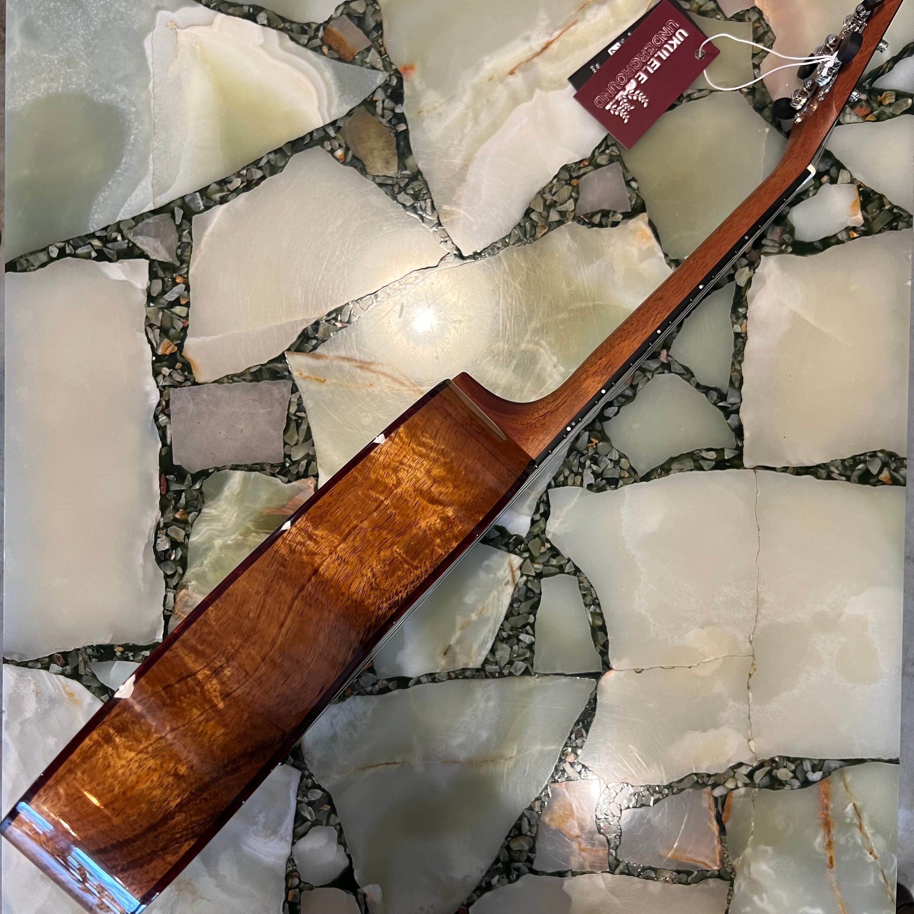 こちらは、鼈甲柄バインディングをフロントとバックの両面に、サウンドホール周りはカーリーメイプルで装飾したシンプルながらも美しさを感じさせてくれるテナーウクレレです。コア材は厳格な選定、グレーディングを行ったプレミアムグレードのものを使用。ヘッドプレートはエボニー製。ポジションマークとヘッドロゴはMOP(Mother-of-pearl)を使用しています。