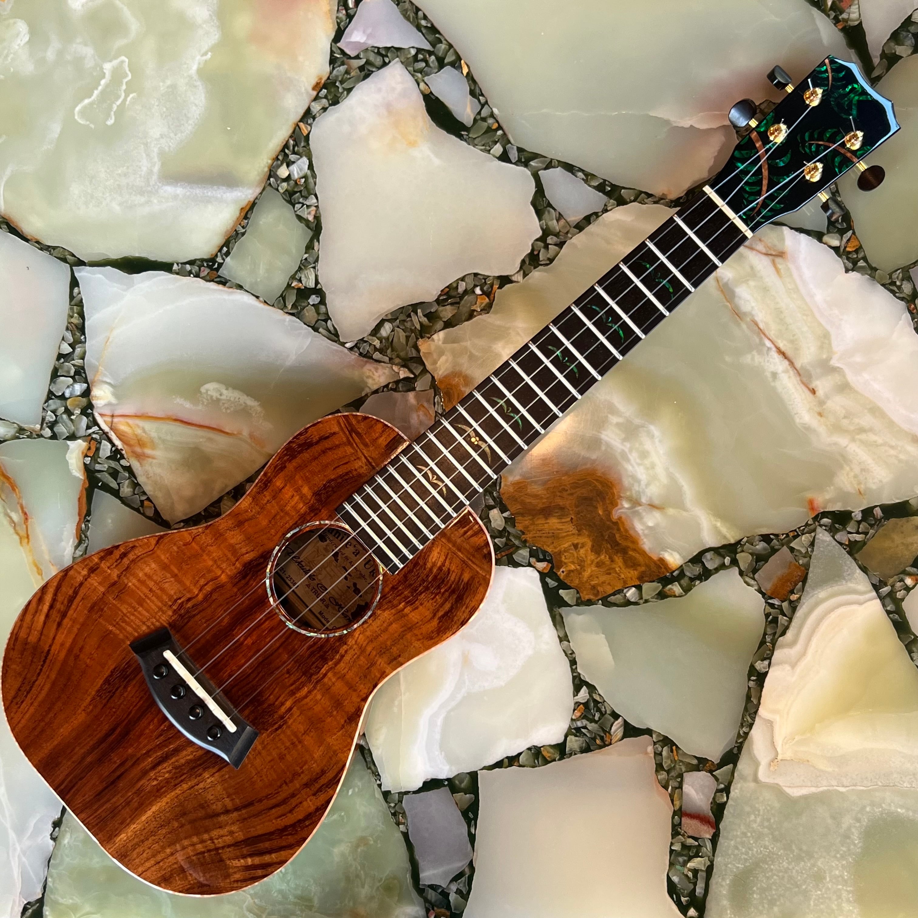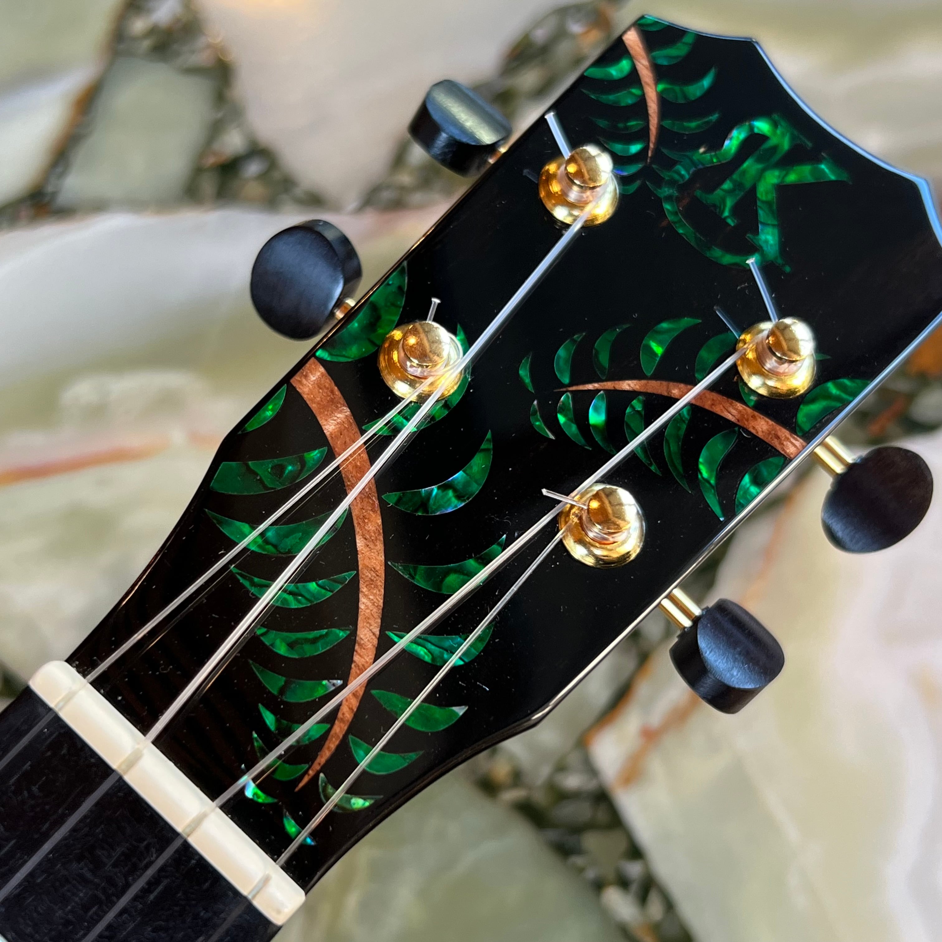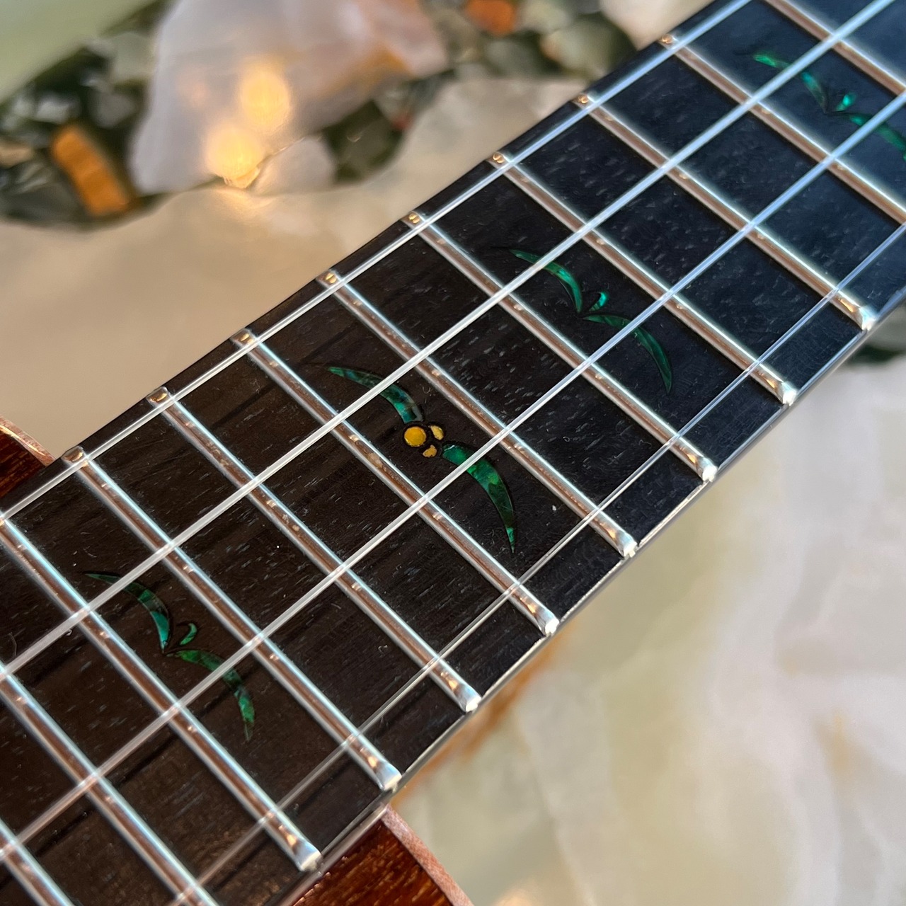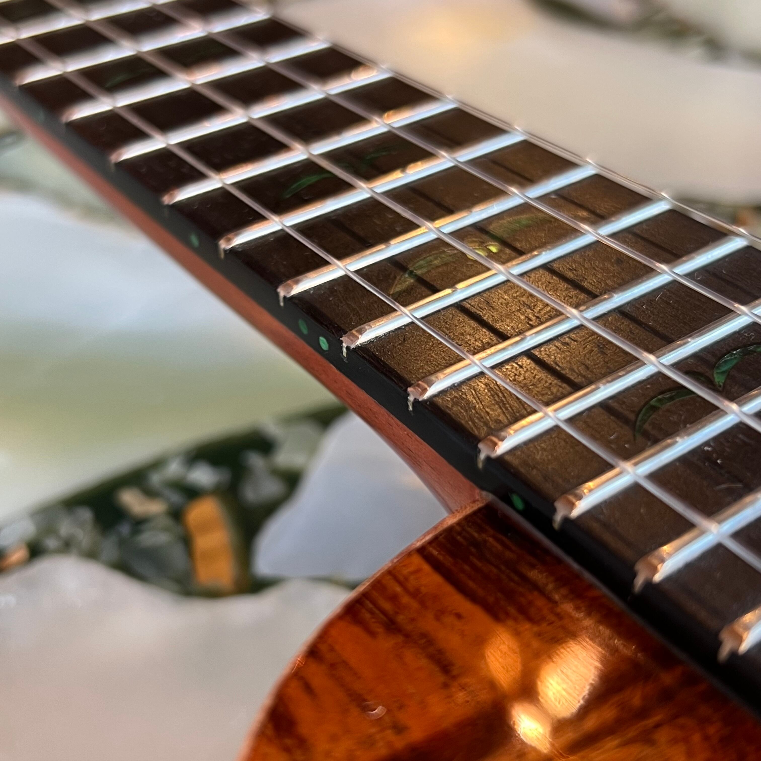 極上のソリッドカーリーハワイアンコア材をボディ全面に使用し、ヘッドと指板には、グリーンアバロンとハワイアンコアを使い、ハワイアンコアの葉っぱをデザインしたインレイが埋め込まれており、見た目も音も満足度の高い1本となっております。