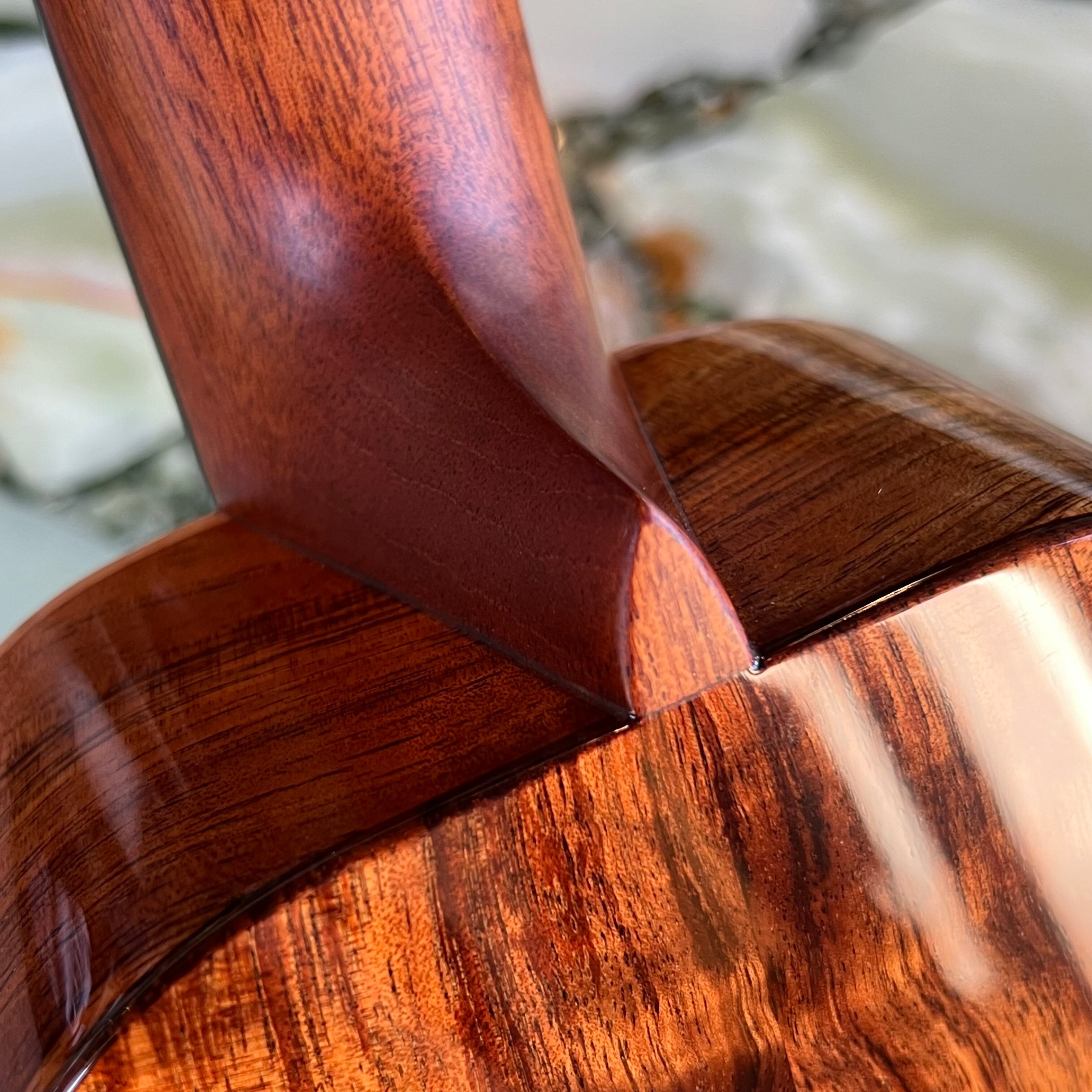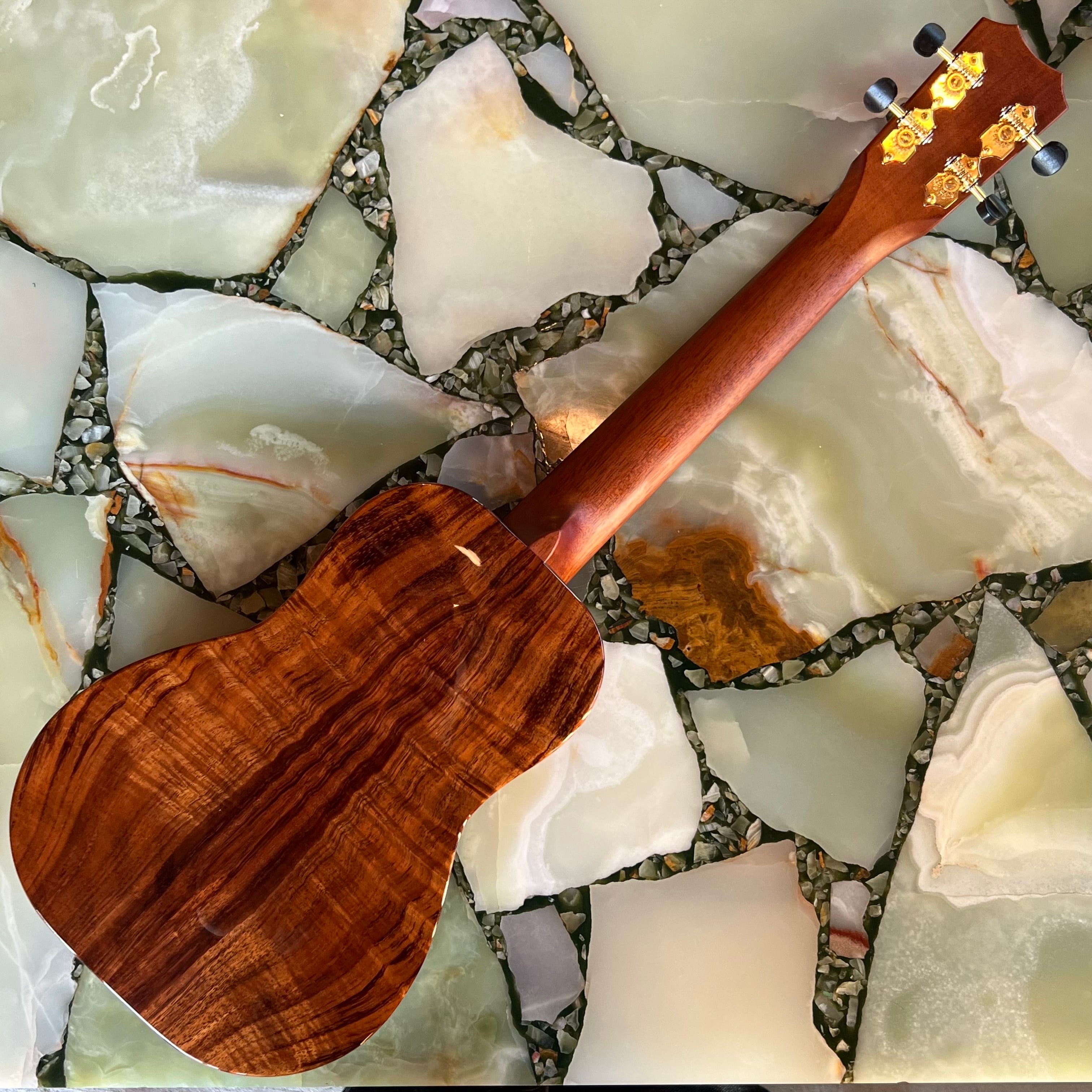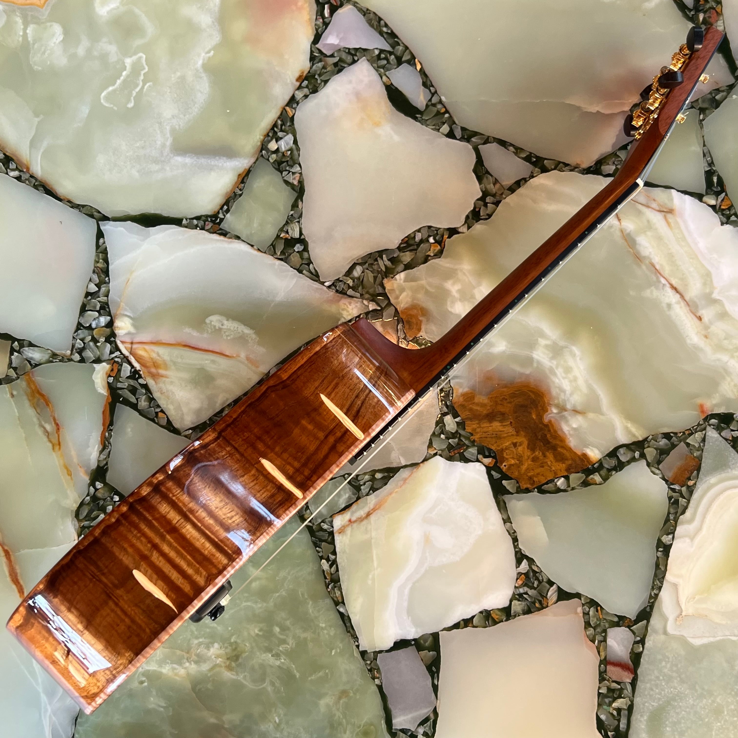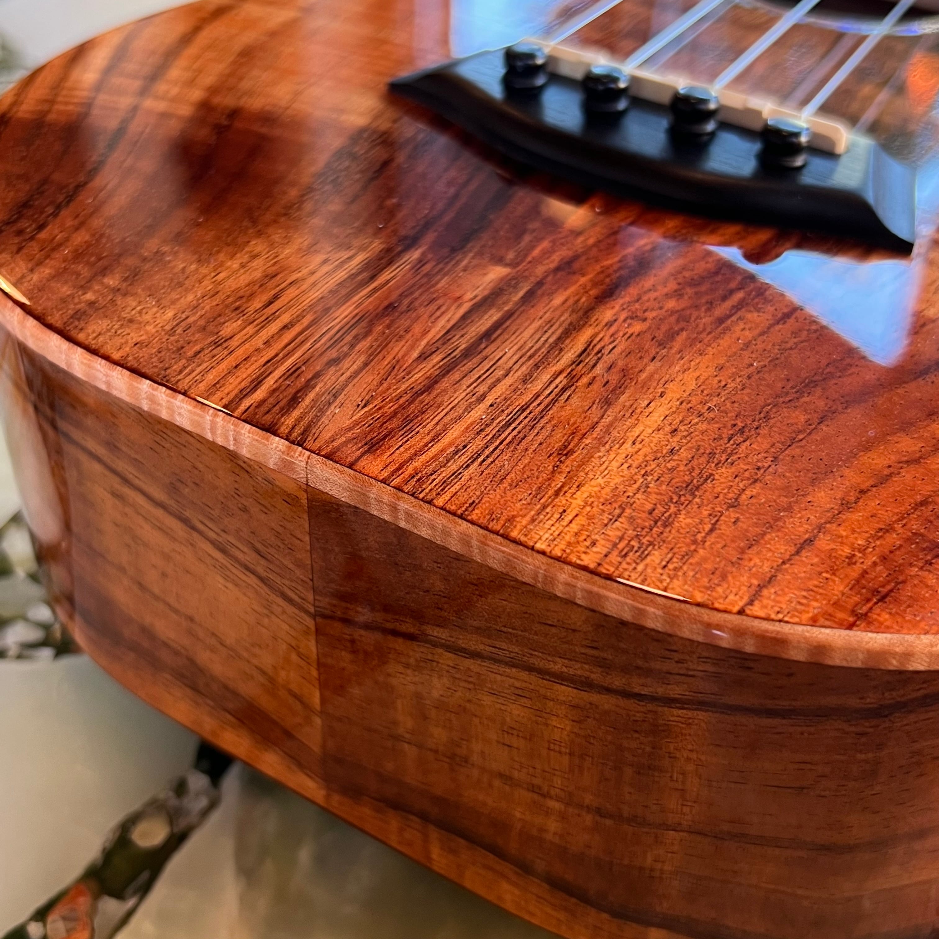極上のソリッドカーリーハワイアンコア材をボディ全面に使用し、ヘッドと指板には、グリーンアバロンとハワイアンコアを使い、ハワイアンコアの葉っぱをデザインしたインレイが埋め込まれており、見た目も音も満足度の高い1本となっております。