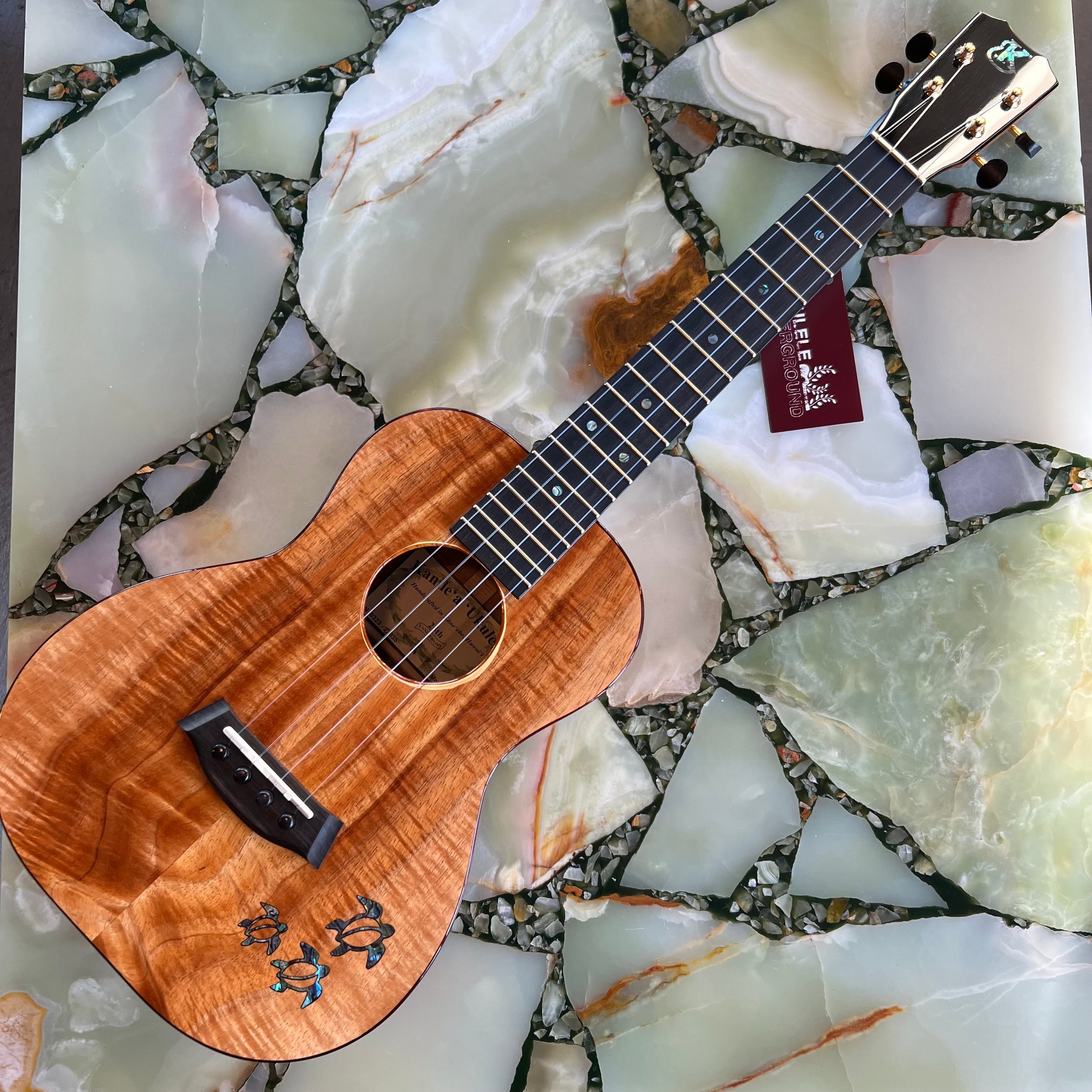 こちらは、ハワイのウミガメ【ホヌ】をあしらったアバロンインレイと、べっ甲柄のバインディングを組み合わせたテナーウクレレです。コア材は厳格な選定、グレーディングを行ったデラックスグレードのものを使用。またアバロンインレイはボディだけでなくポジションマークにも採用されています。