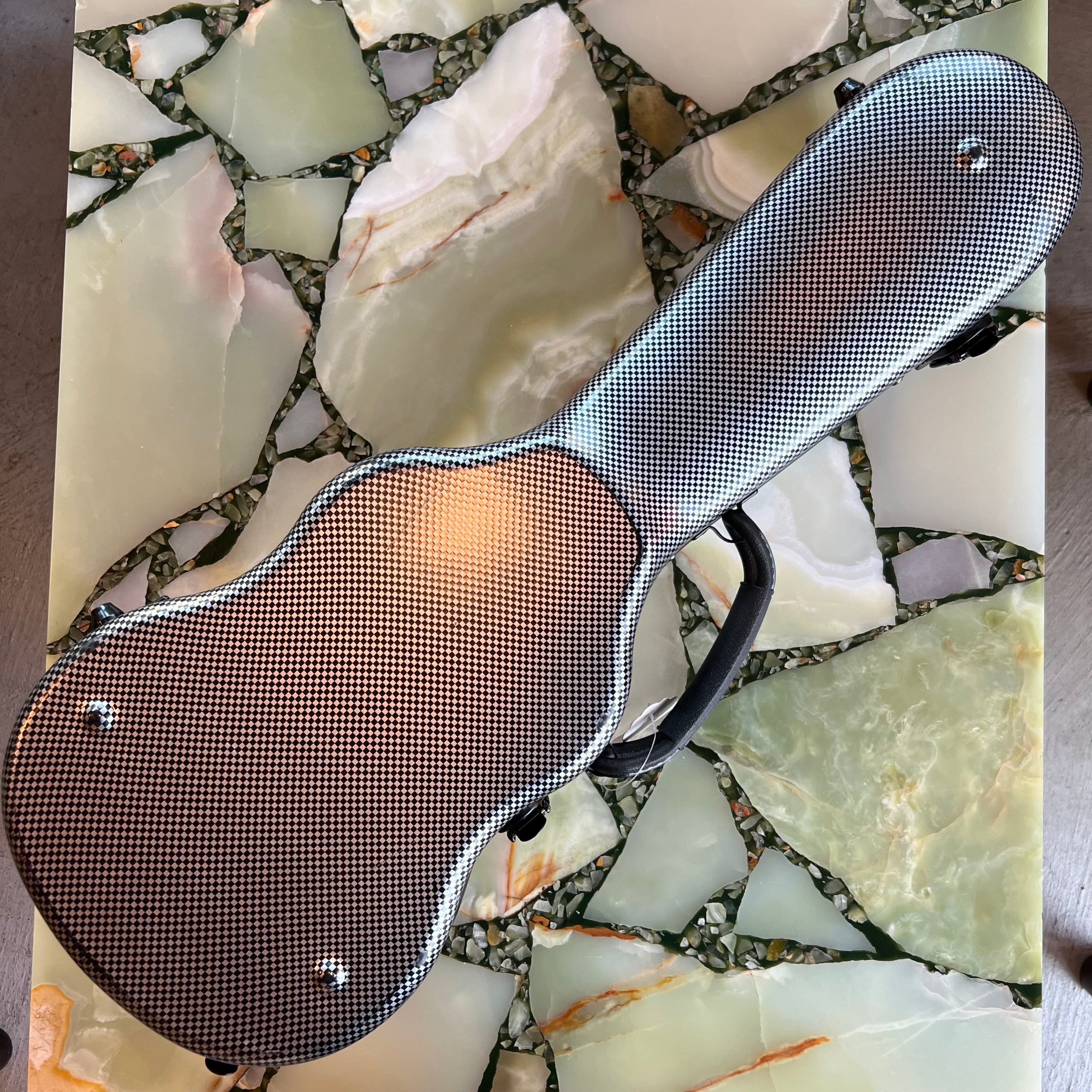 こちらはフロントのブラックバインディングに黒白黒のサウンドホールをあしらったコンサートウクレレ。コア材は厳格な選定、グレーディングを行ったデラックスグレードのものを使用。ヘッドプレートはエボニー製。ポジションマークとヘッドロゴはMOP(Mother-of-pearl)を使用しています。