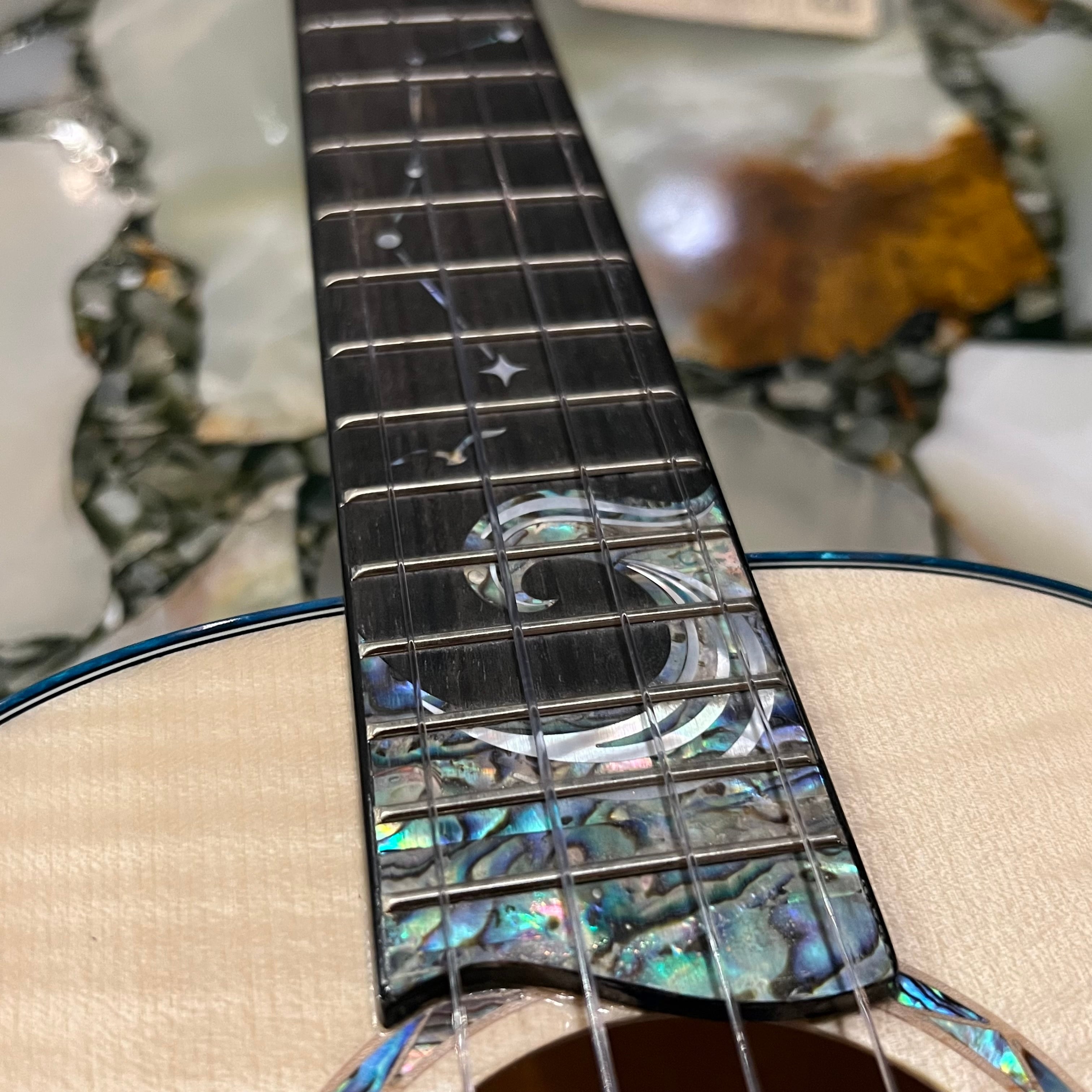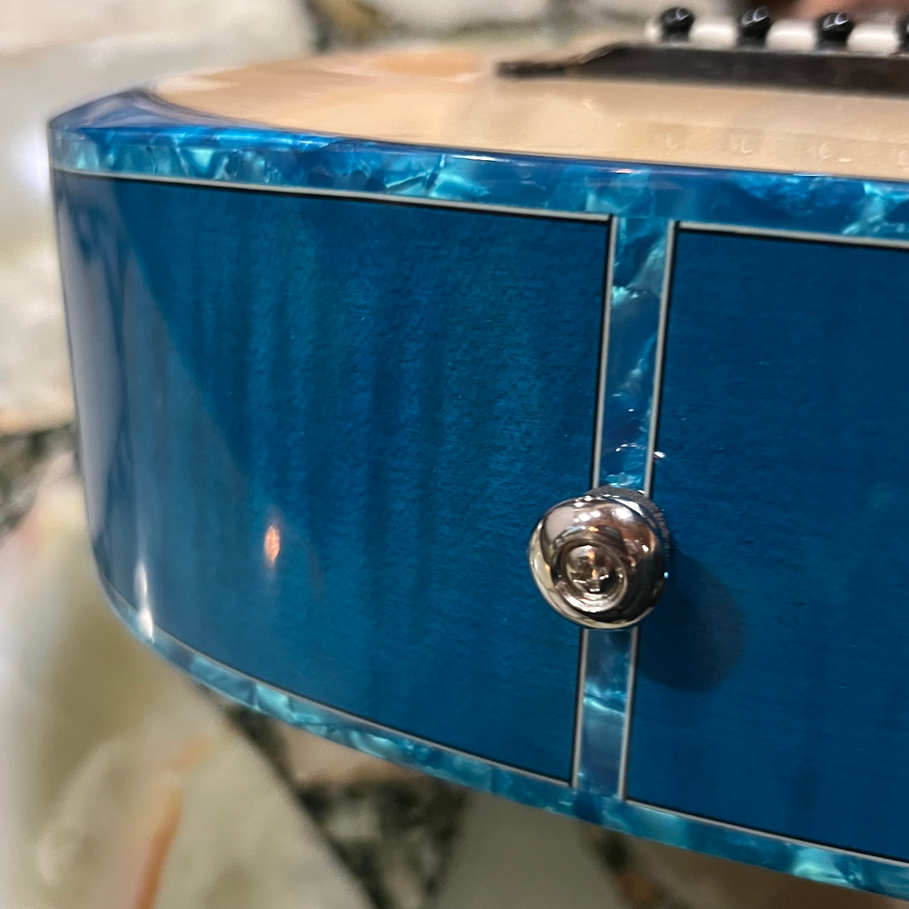 ボディには美しい杢目のフレイムメイプル材単板を使用し、随所に施されたアバロン貝のインレイは見事なもので、高級感が漂います。