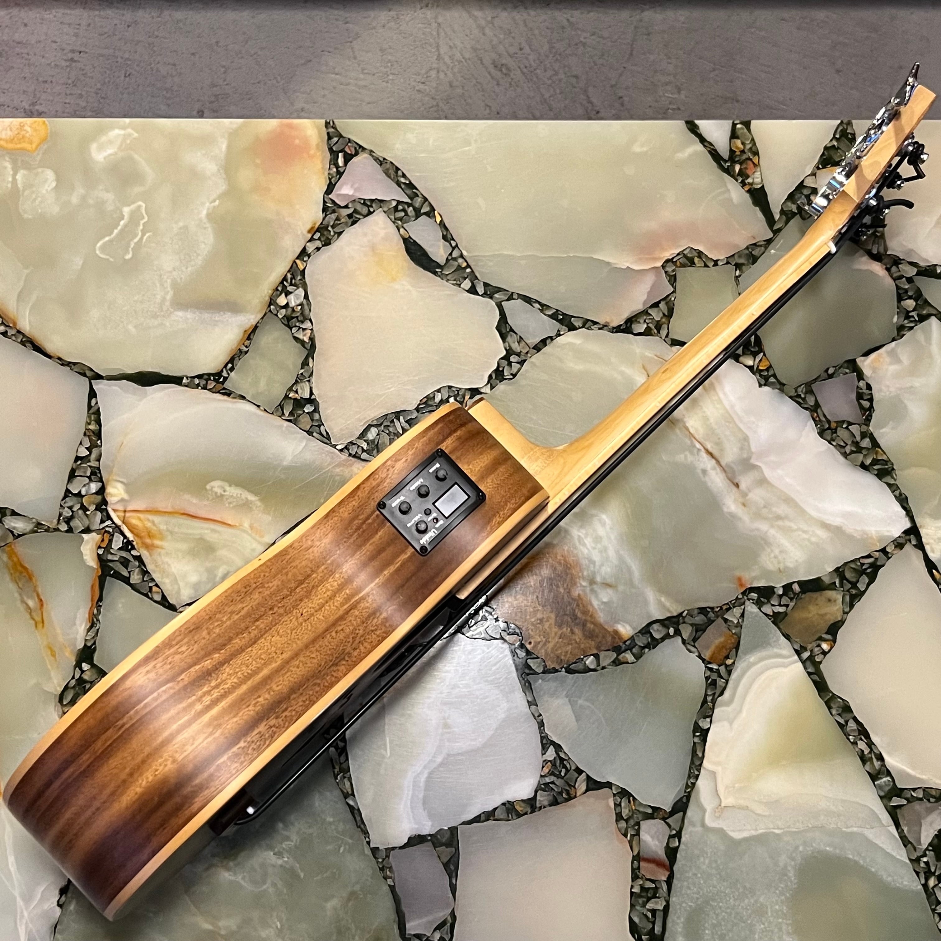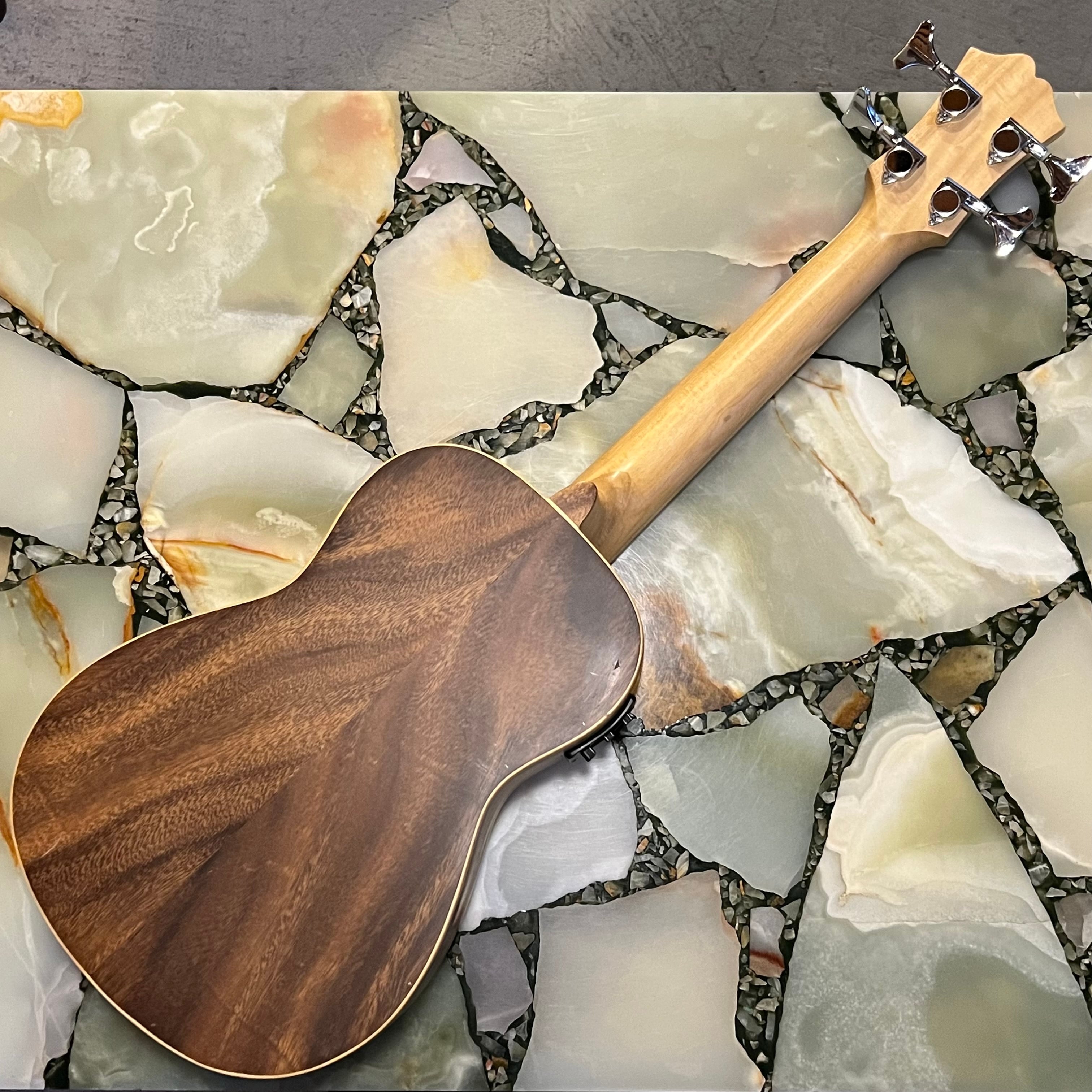 で作られた、珍しいハワイ製・オール単板ボディのフレットレスのウクレレベースです。