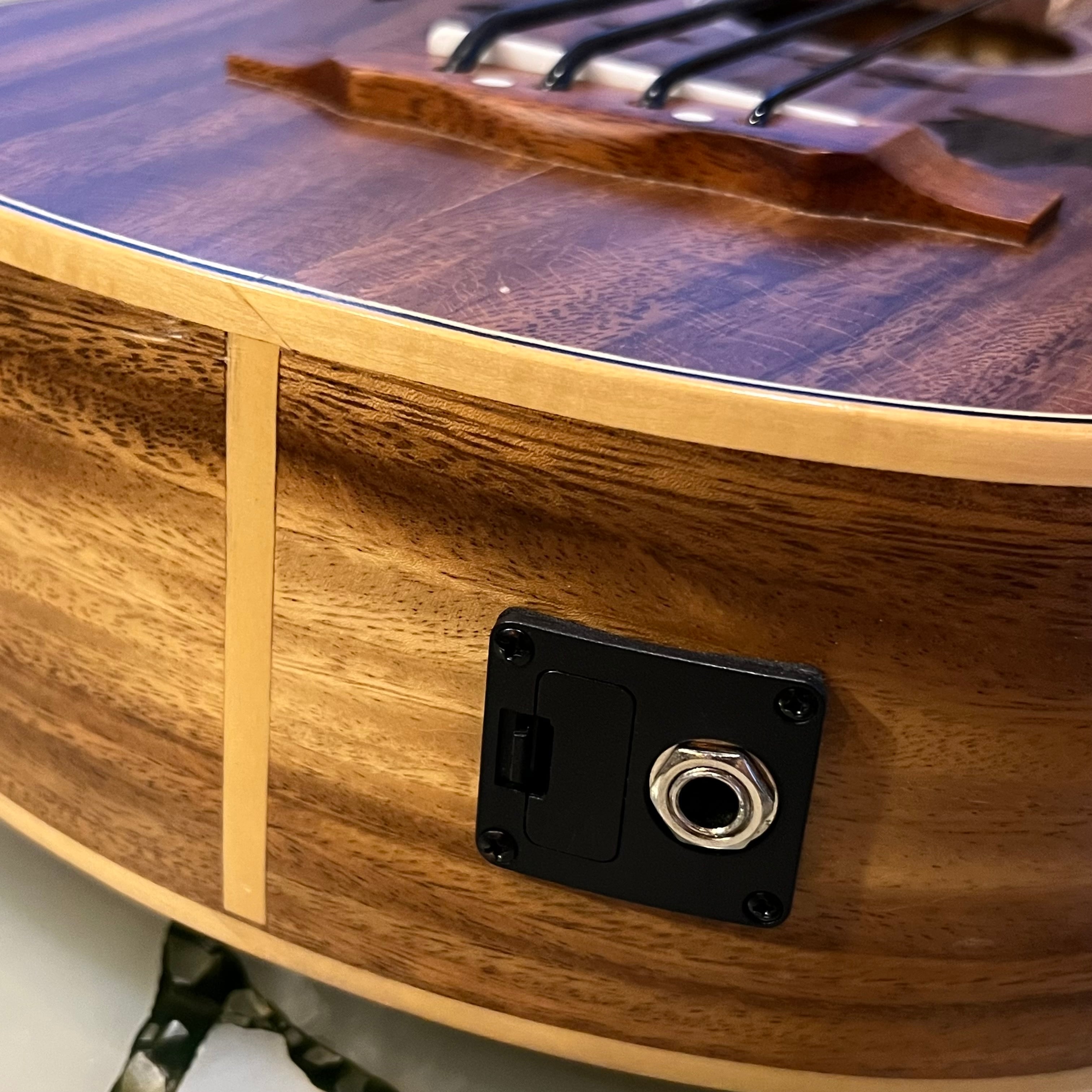 こちらのウクレレベースは、ボディにブランドネームの通り、ハワイのモンキーポッド単板
