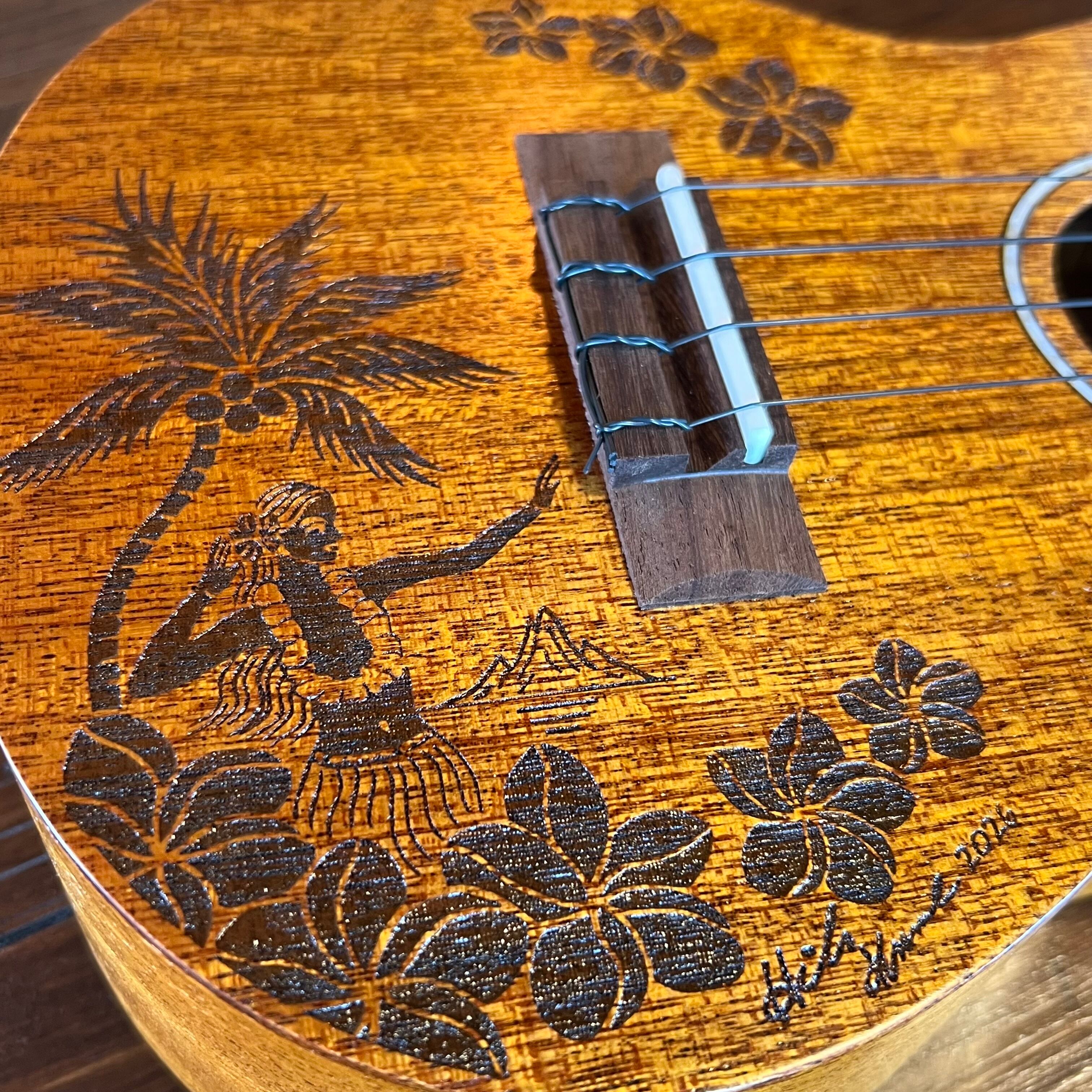 ハワイアンアートの第一人者Hilo Kume(ヒロクメ)氏のイラストをレーザー彫刻でボディトップに表現したデザインを特徴とするウクレレです。
