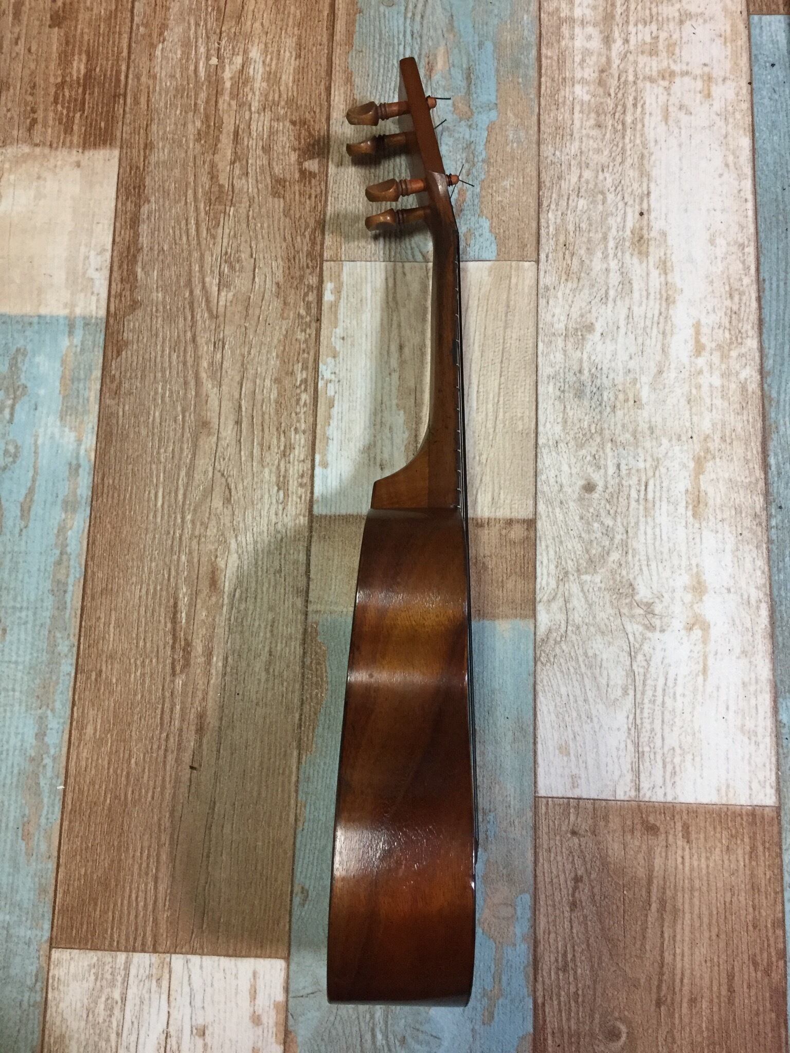 昔ながらの指板の無い仕様、細身のボディ、木製ペグという特徴があります。