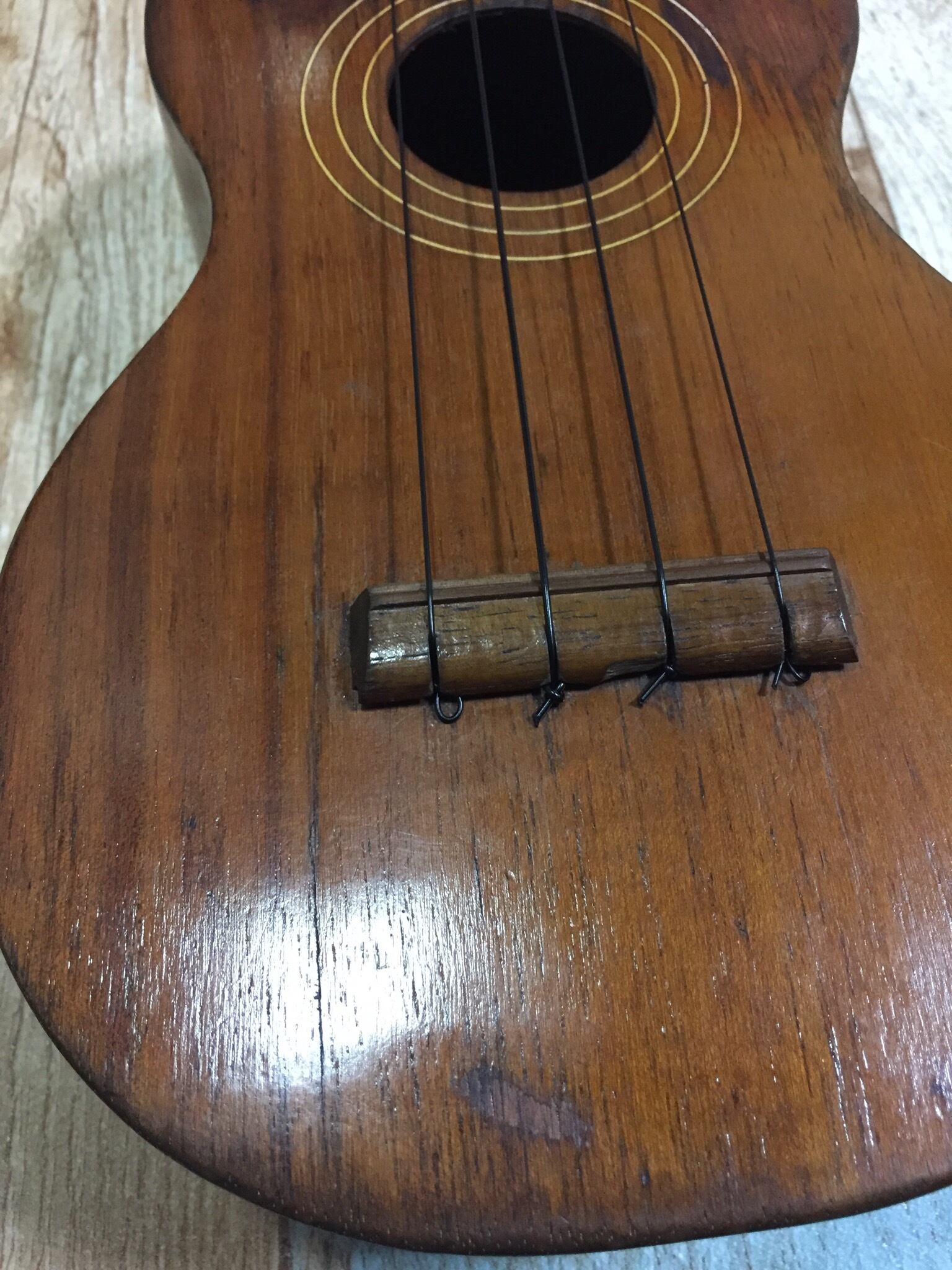 この時期のウクレレは複数の割れや反りなど、状態の悪い個体が多く、それが音量、音質が良くない原因の一つになってるか思いますが、こちらのウクレレはTOP板に10cm程度のクラックが1箇所だけで、このクラックは押しても動きません。裏からパッチが貼られてるかどうかまでは判断できません。