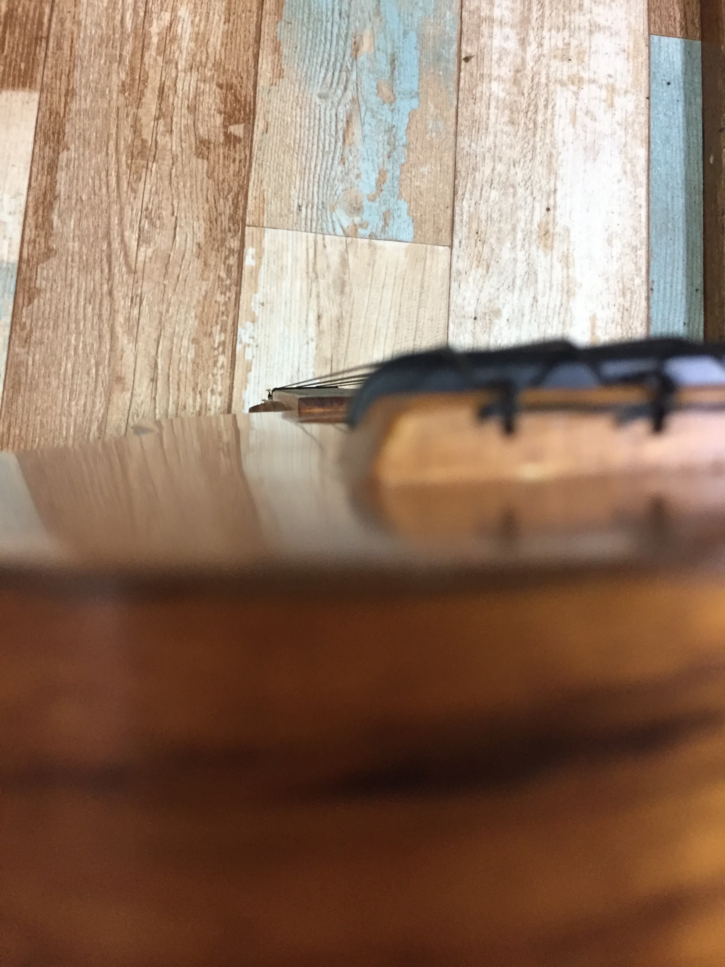 弦高は12フレットで、約3.6mm程度です。ナットはギリギリまで下げてますので、特に弾きにくいとは感じませんが、サドルを削って後1mm位までなら下げられますので、ご希望の方には無料でサドル調整もしてから発送致します。