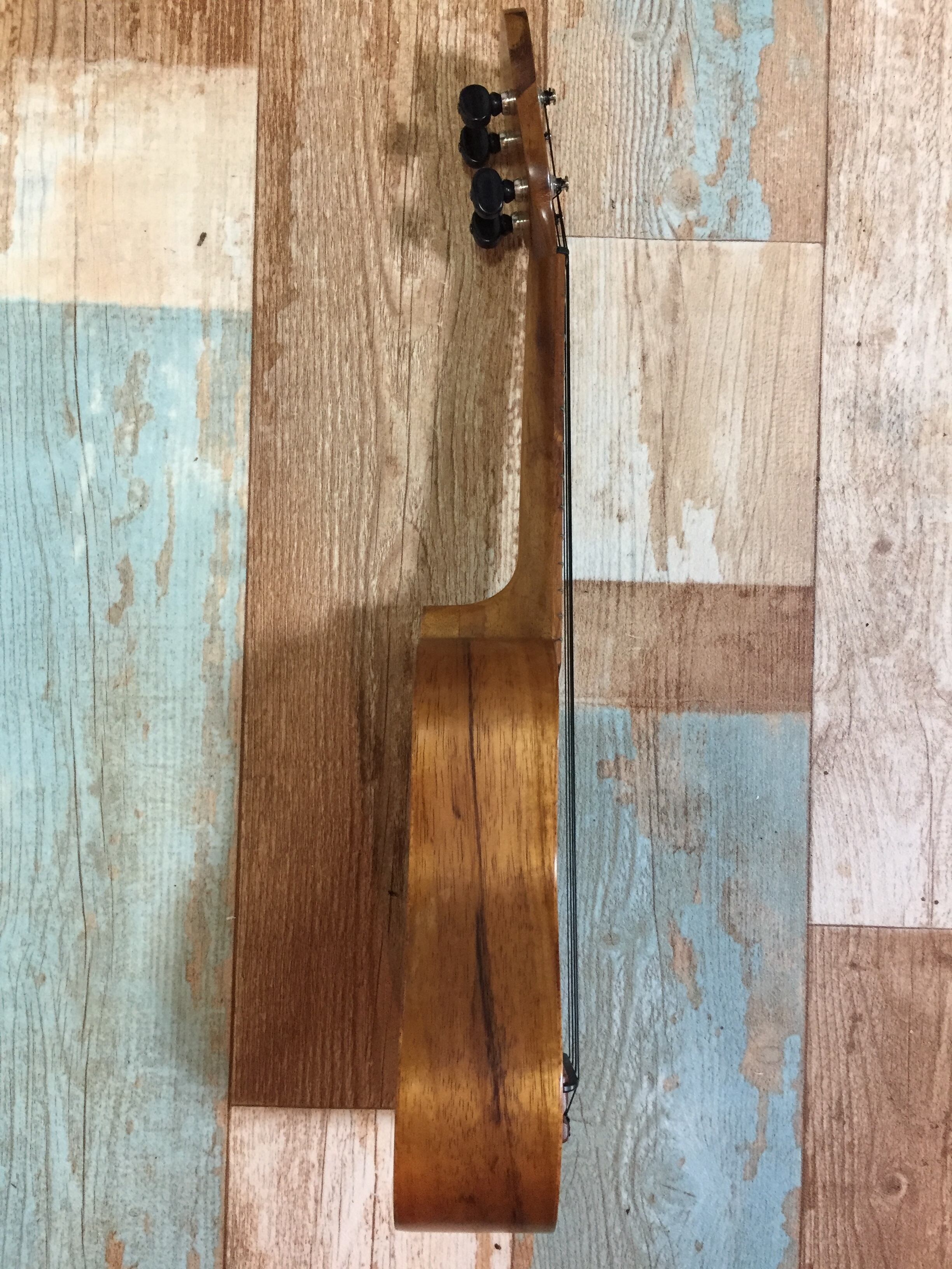 ボディ材はオールハワイアンコア単板で、しかもTOP、SIDE、BACKには、現在では珍しく1枚もののハワイアンコア単板を使用しており、音量、サスティーンの事を最大限に重視して作られてます。(昨今のウクレレは単板でも大半が2枚を継いで使用するブックマッチという方式で木材を使用してます。)