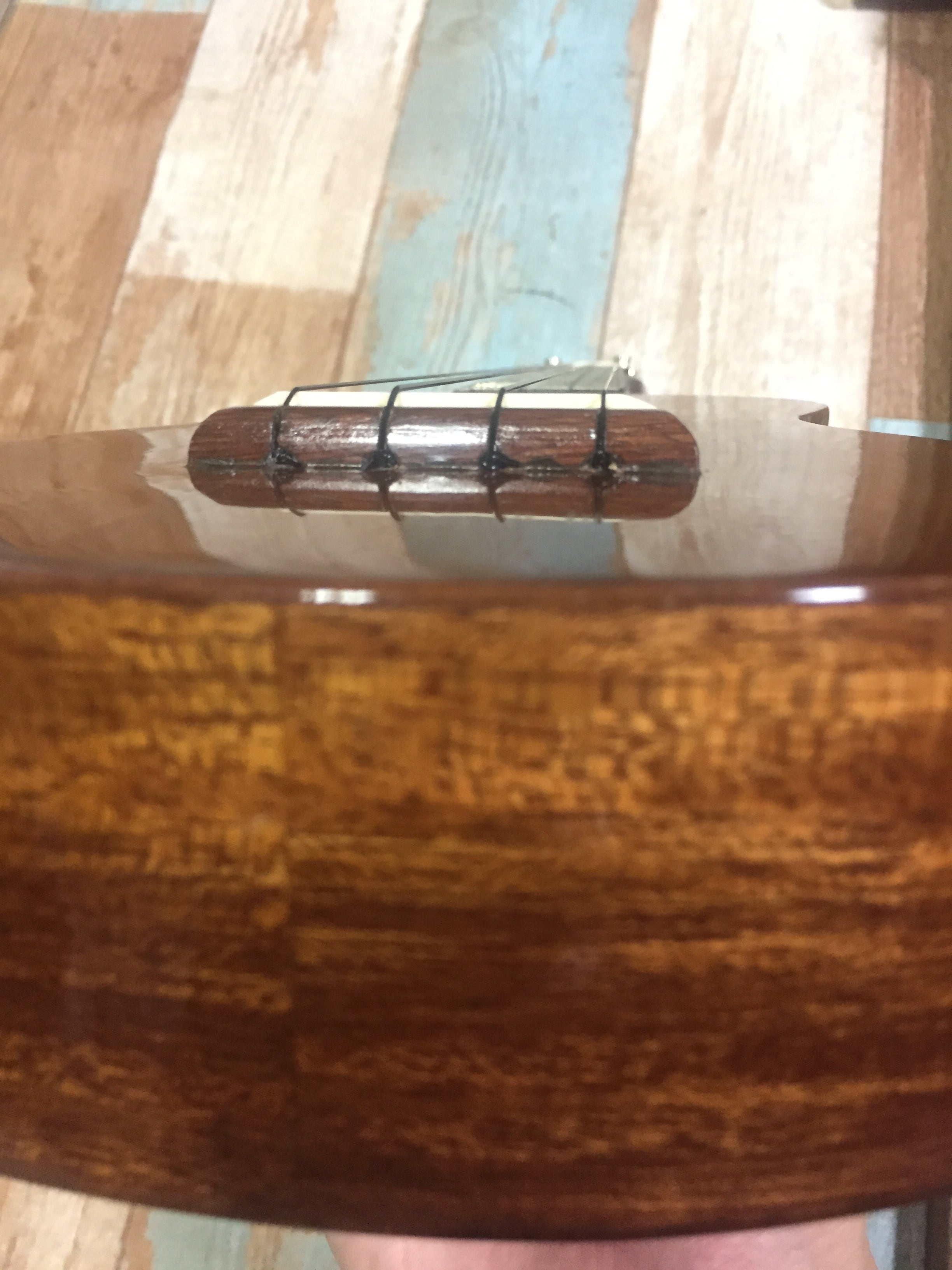 写真ではブリッジに隙間があるようにも見えますが、塗装の縁が白く反射しただけで、隙間は空いてませんのでご安心下さい。(サドルの残りの高さとサイド材を写真に撮りたかった為、この写真を使用してます)