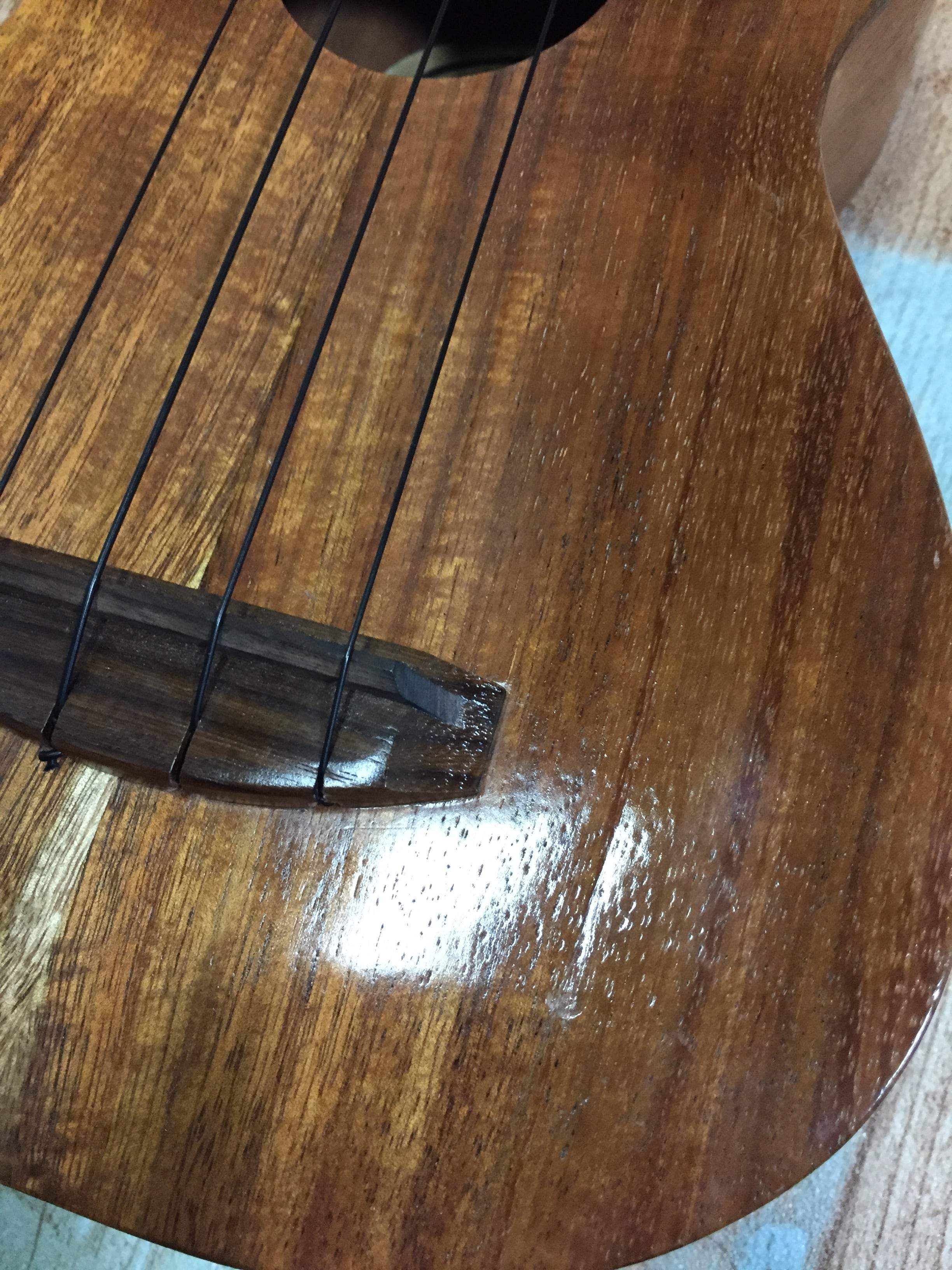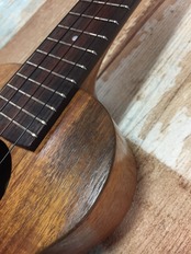 kamakaなど高級ウクレレと同じく、柔らかく響きを遮りにくい、尚且つエイジングも早いラッカー塗装を採用している為、演奏によりTopは塗装が剥げている部分があります。