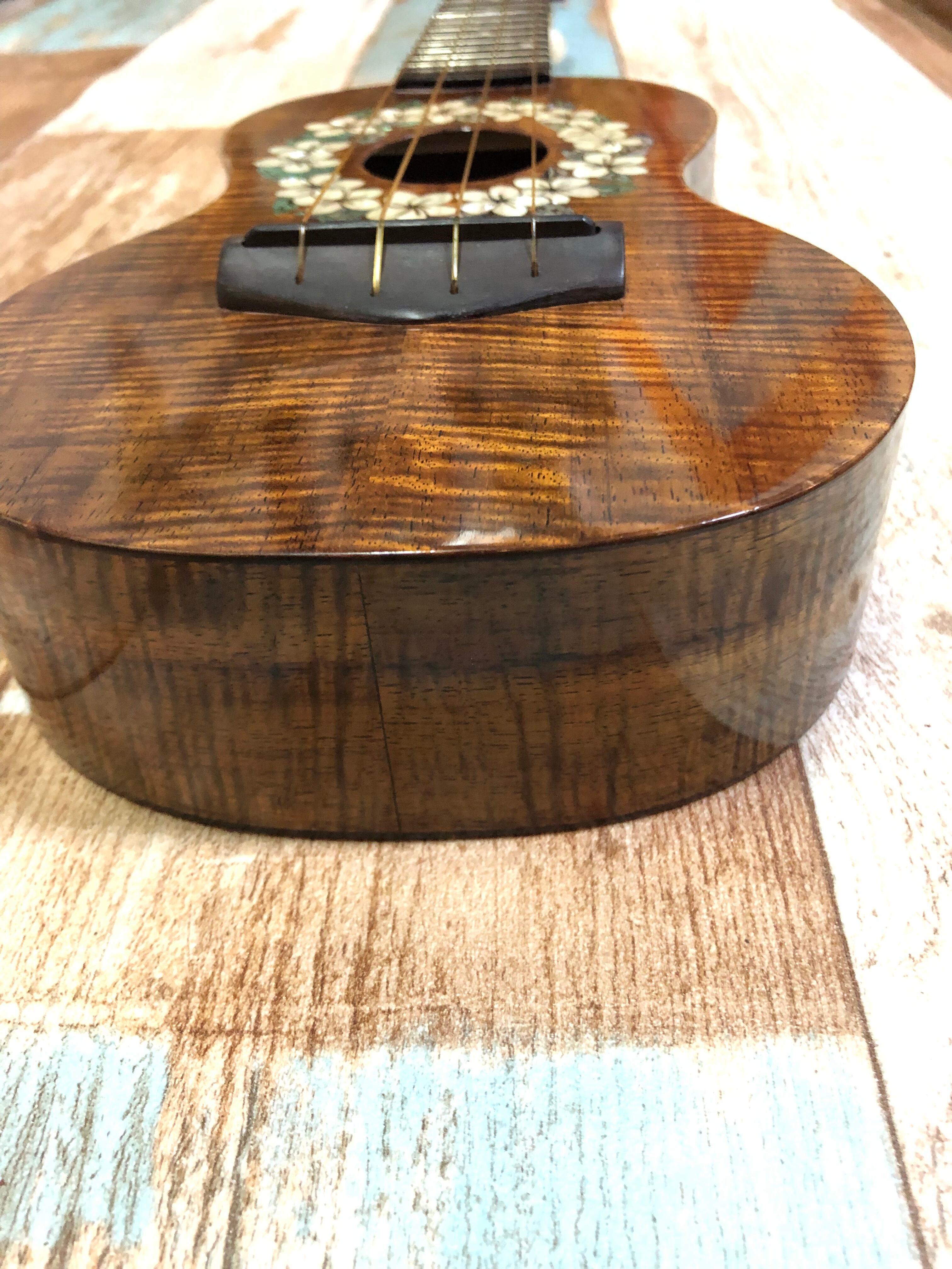 こちらのウクレレは、カスタムモデルの為、極上のフィギュアドハワイアンコアを使用しております。