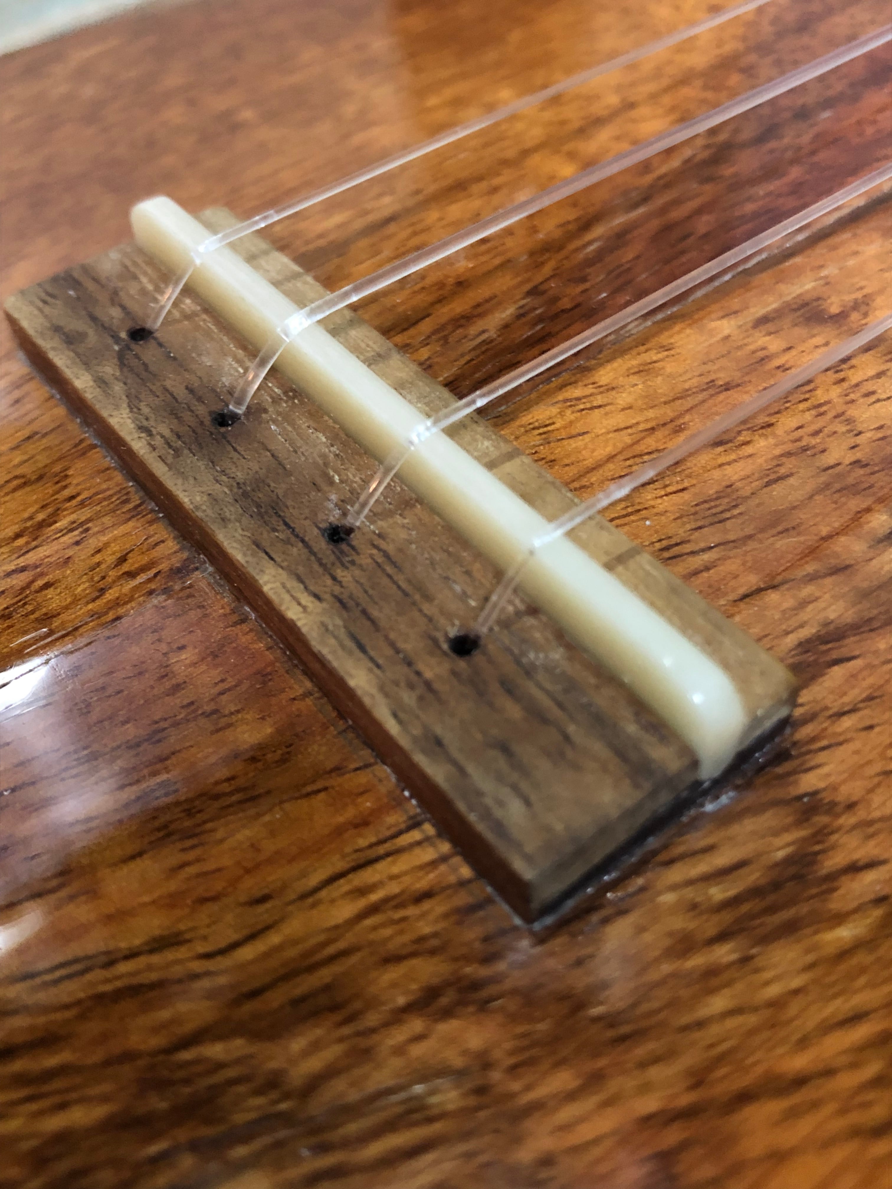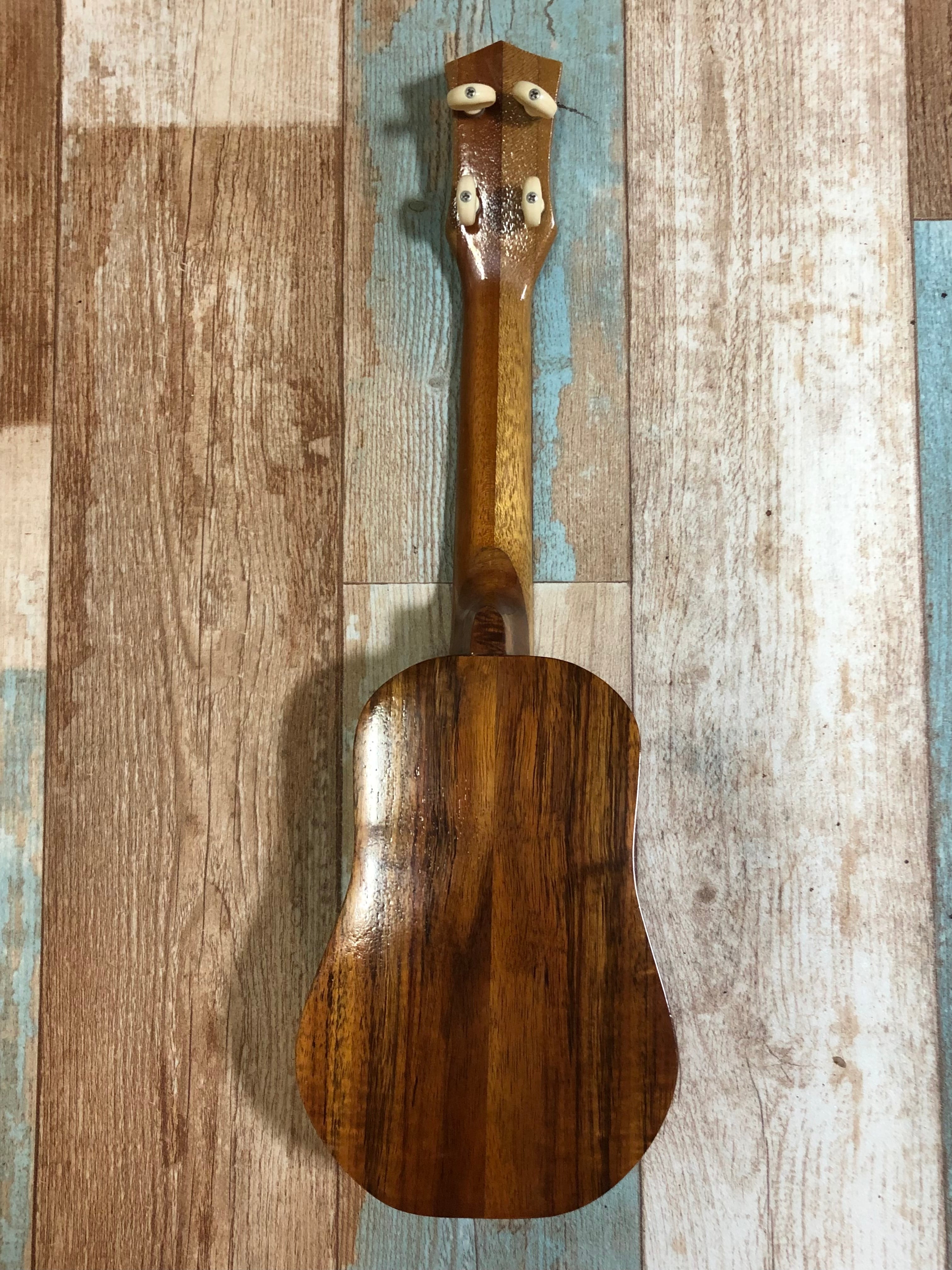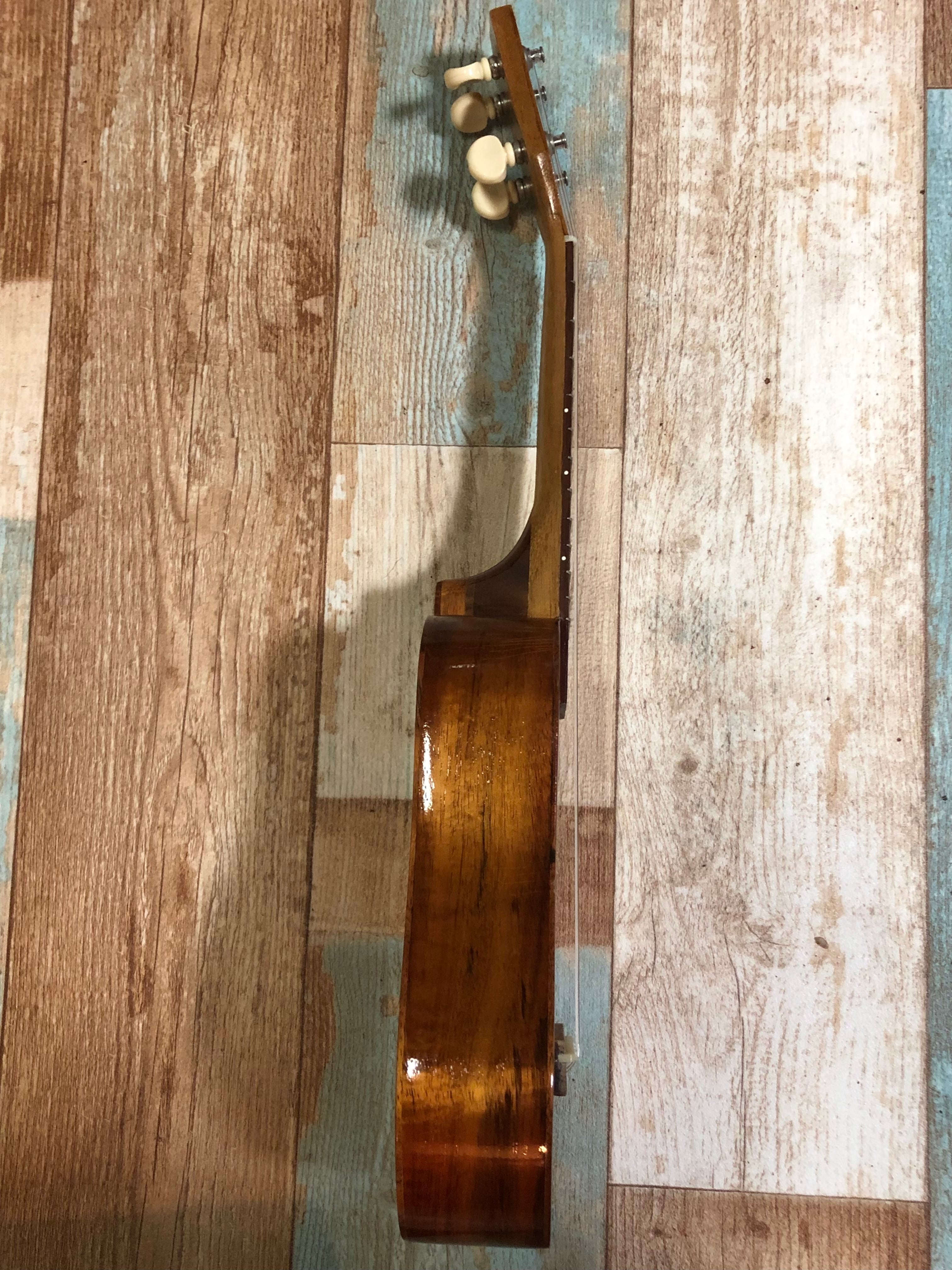 ハワイ ホノルルで作られた、Ukulele Guild of Hawaiiにも出品してるEmil Bader氏の作品です。小ぶりなボディに、裏通しのブリッジという仕様です。裏通しブリッジは、ブリッジ剥がれのトラブルを最小限に防ぐ役割と共に、弦のサドルへの圧力がしっかりかかる手法で、昨今の高級ウクレレでもよく採用されてます。