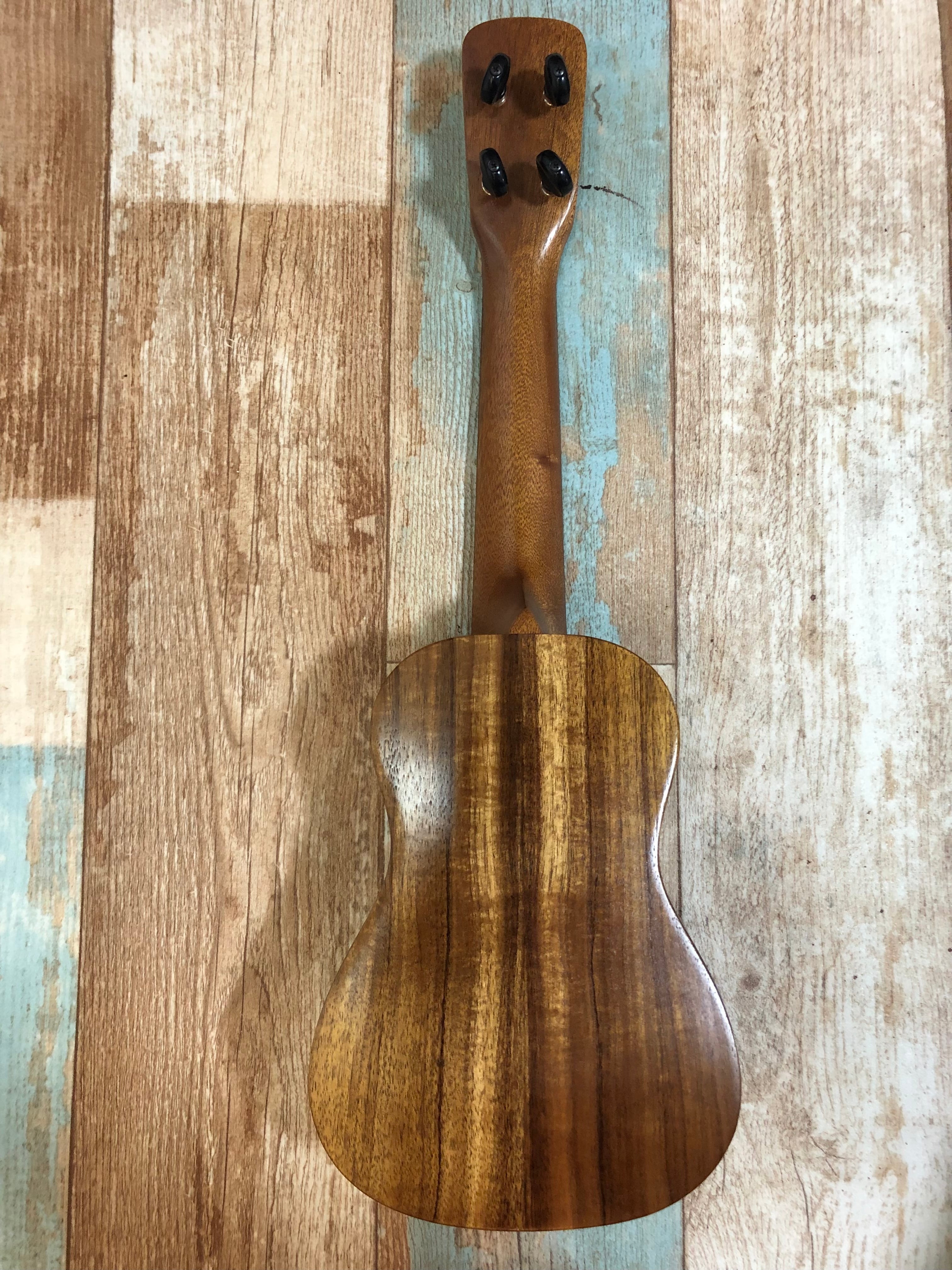 ネックはストレートで、ナットの調整をし、弦高は12フレットで4弦側約2.6mm、1弦側約2.5mmで、演奏性も良好です。ハワイ製にありがちなオクターブピッチのズレもほぼありません。もう少し弦高を下げたいという方には事前にお伝え頂ければ無料で下げてから発送致します。