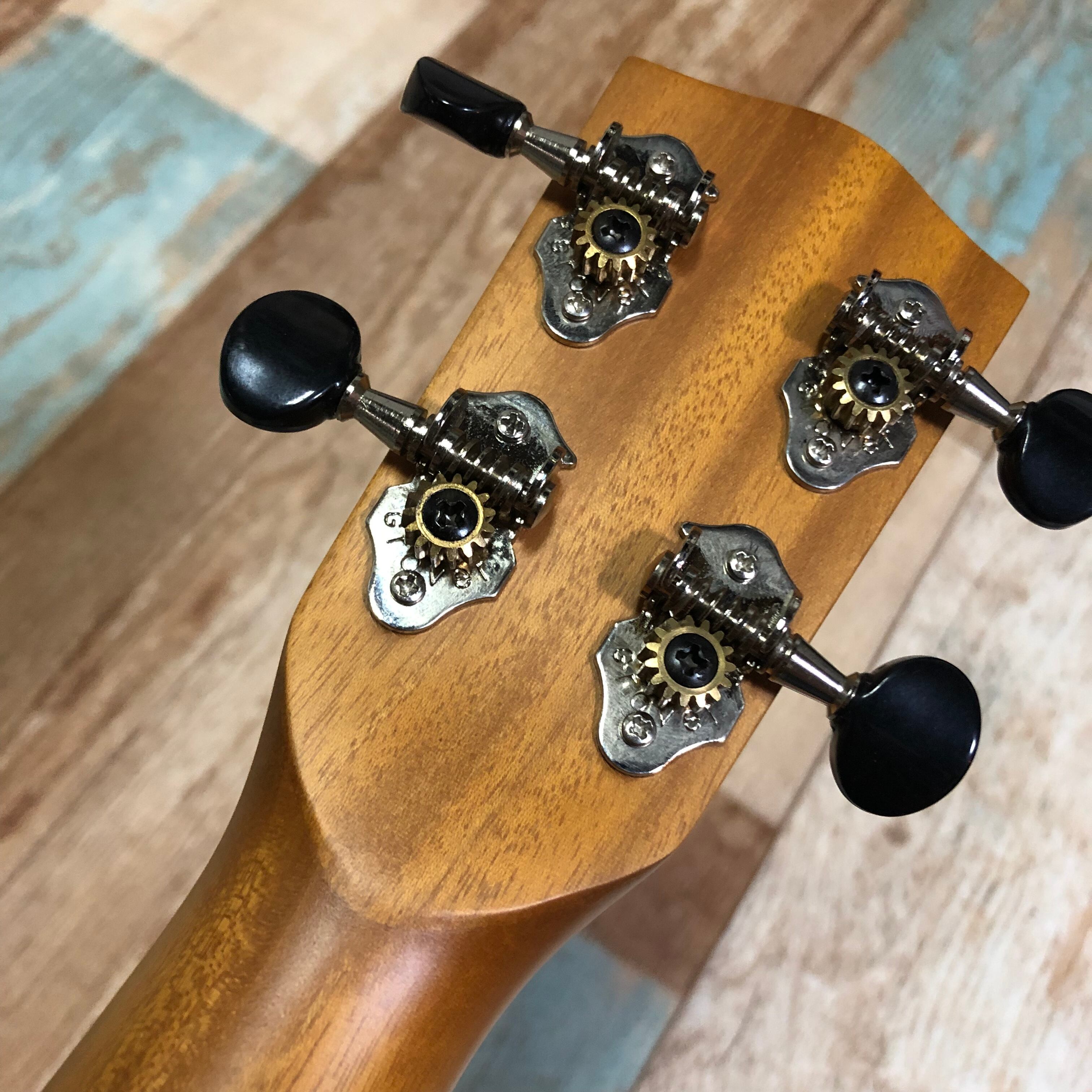 ネックはまっすぐで、ナット・サドルもベストな状態にし、弦高は12フレットで約2.2〜2.5mmで演奏性は抜群、全フレット問題なく、指板の両サイドにはバインディングが施されておりフレット飛び出しのトラブルも起こらず、ハワイ製ウクレレにありがちなオクターブピッチのズレもほぼありません。