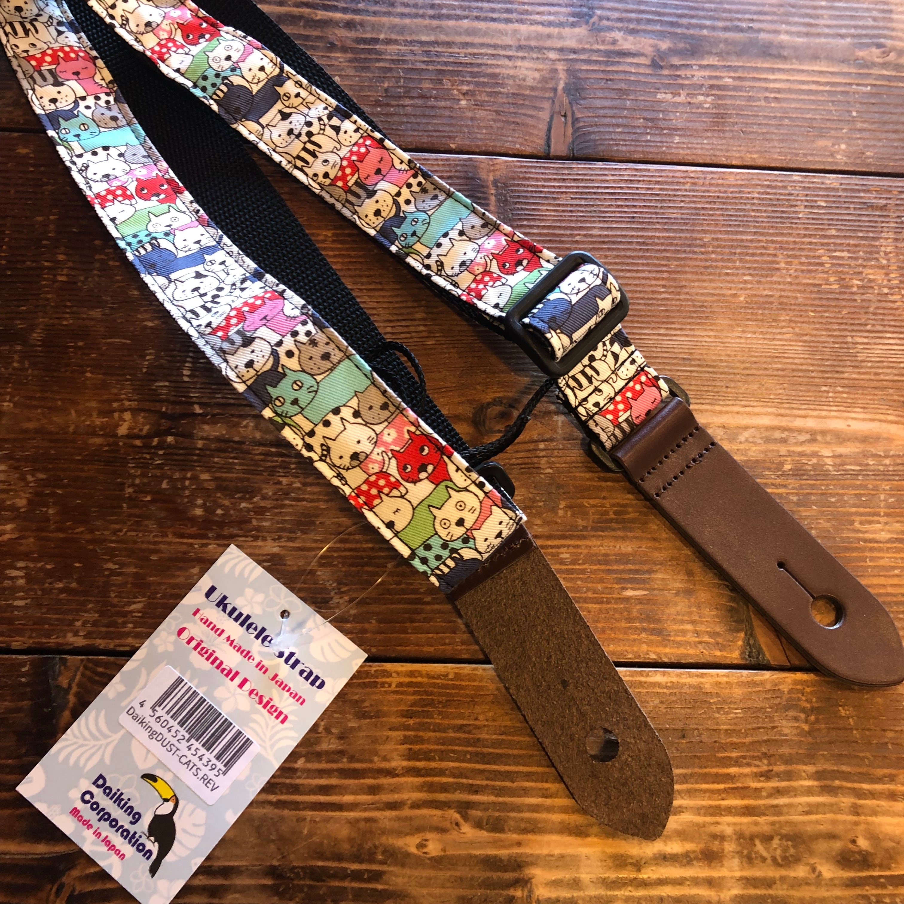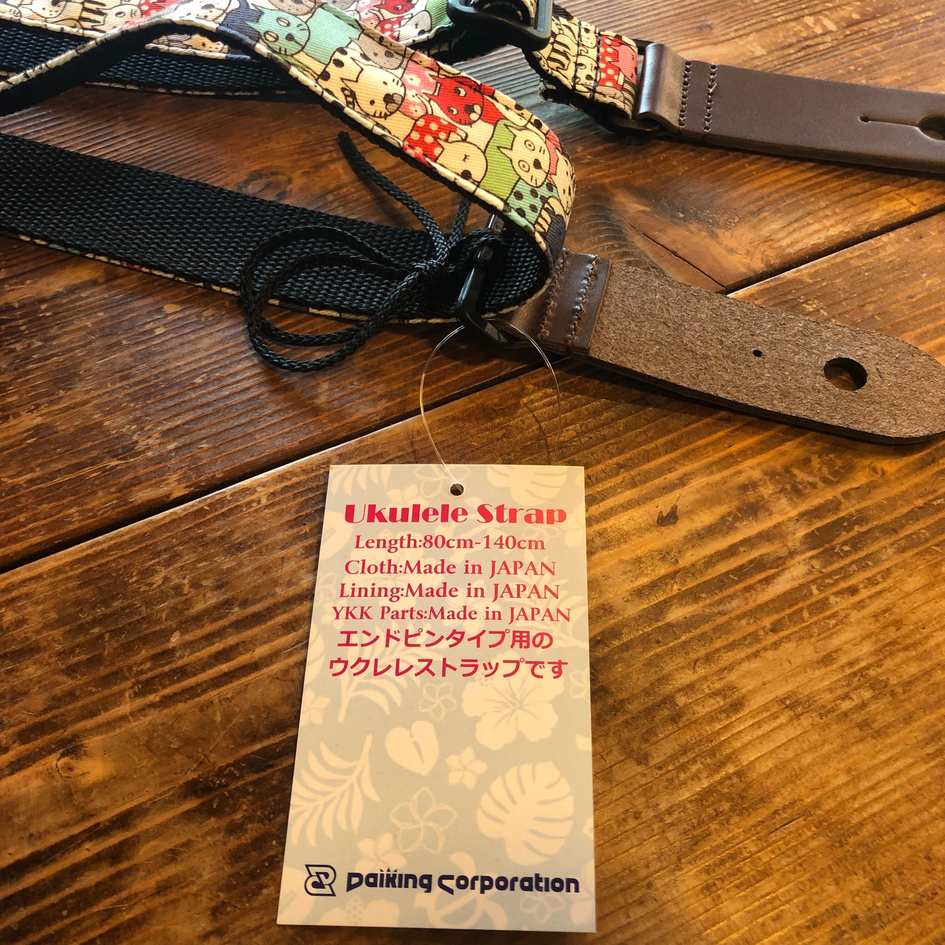 ストラップピンが既に付いてる、またはこれからストラップピンを取り付けて使用するためのストラップです。ストラップピンを取り付ける両側エンドには厚みのある牛本革を使用しています。また裏地に使用しているテープは日本製です。表の生地も日本製。ウクレレ本体をキズつけにくいYKK製プラスチックパーツを使用しています。湘南の工房にて、1本1本ハンドメイドで作られております。