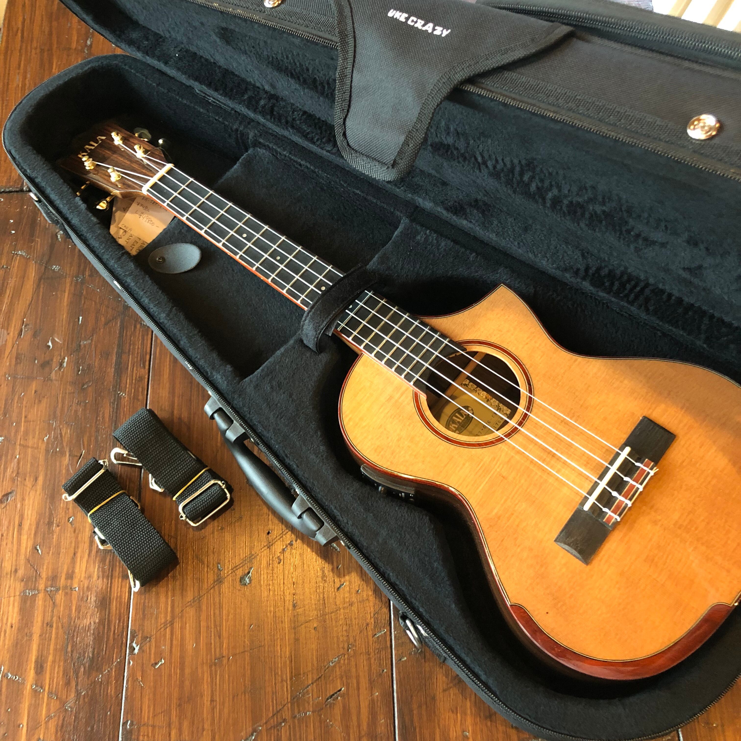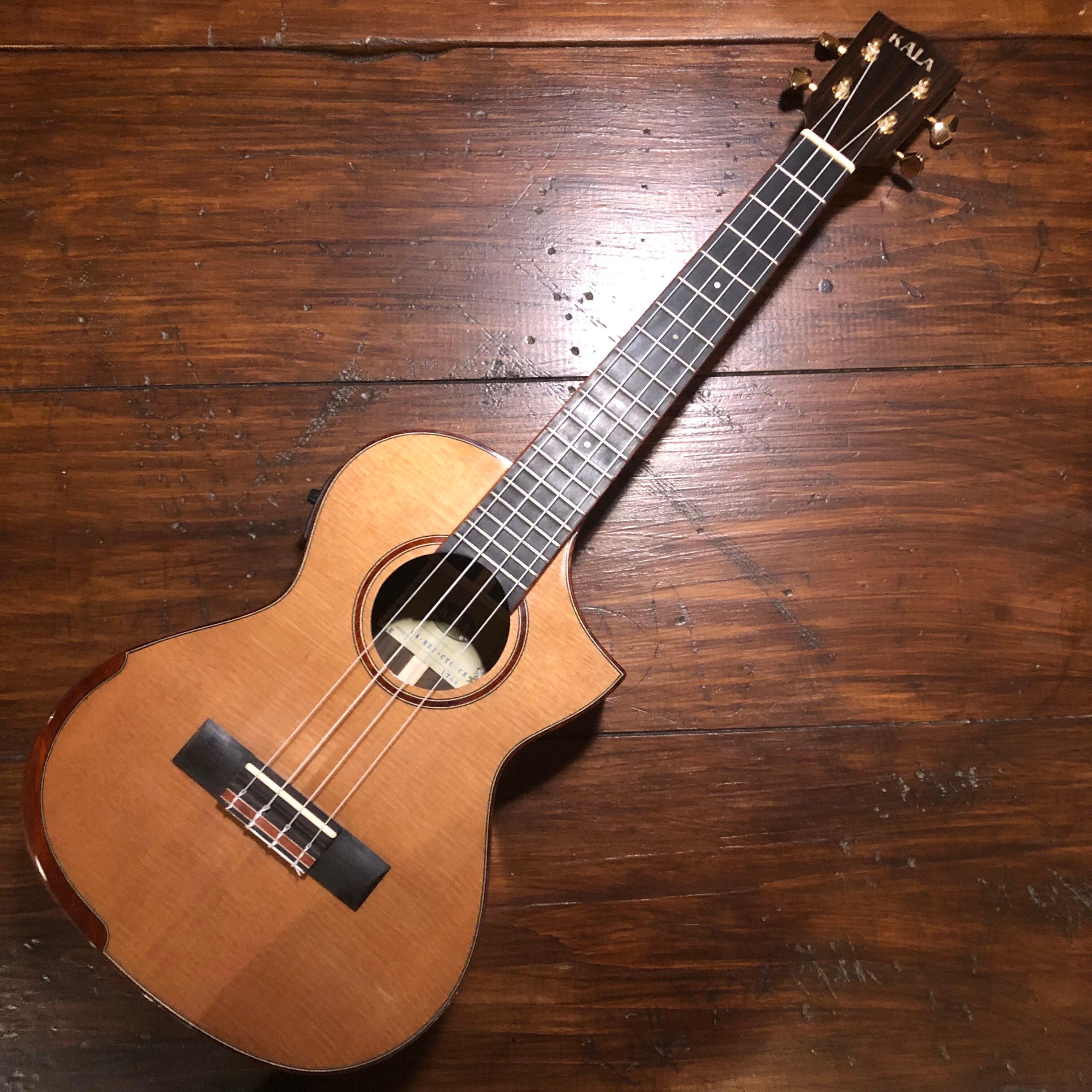 全米でのシェアNo.1を誇る人気ブランド『KALA』。豊富なラインナップとコストパフォーマンスに優れた楽器は、幅広くプレイヤーに受け入れられています。「Comfort Beveled Edge(コンフォートベベルドエッジ)」と名付けられたこのウクレレの最大の特徴はボディ下部につけられた傾斜(Bevel)です。パドゥークを使用して付けられたこの傾斜により、構えた時の右腕へのストレスを軽減し、想像以上の快適な演奏性を実現しました。木材にもこだわり、トップ材はシダー単板を使用。更にサイド&バックにローズウッドを単板で使用するという贅沢な仕様で、品のある艶やかなサウンドを奏でます。更に、KALA オリジナルプリアンプを搭載し、幅広いジャンルでの使用を可能にしております。また、KALA のテナーウクレレで初となるフローレンタインカッタウェイを採用し、従来品とは違う優美さと共に高い操作性を実現。ロゼッタ、バインディングにはパドゥークを採用し、落ち着いたボディーカラーの中に差し色としての朱が際立つ美しく華やかなモデルに仕上がっています。