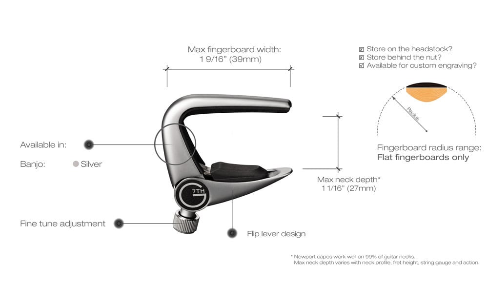 ニューポートカポは、G7thの流麗なデザインを受け継ぎながらも、スリムなシェイプで軽量化を実現。新しいメカニズムはテコの原理でワンタッチホールド可能で、装着してからも圧力調整が簡単に行えます。