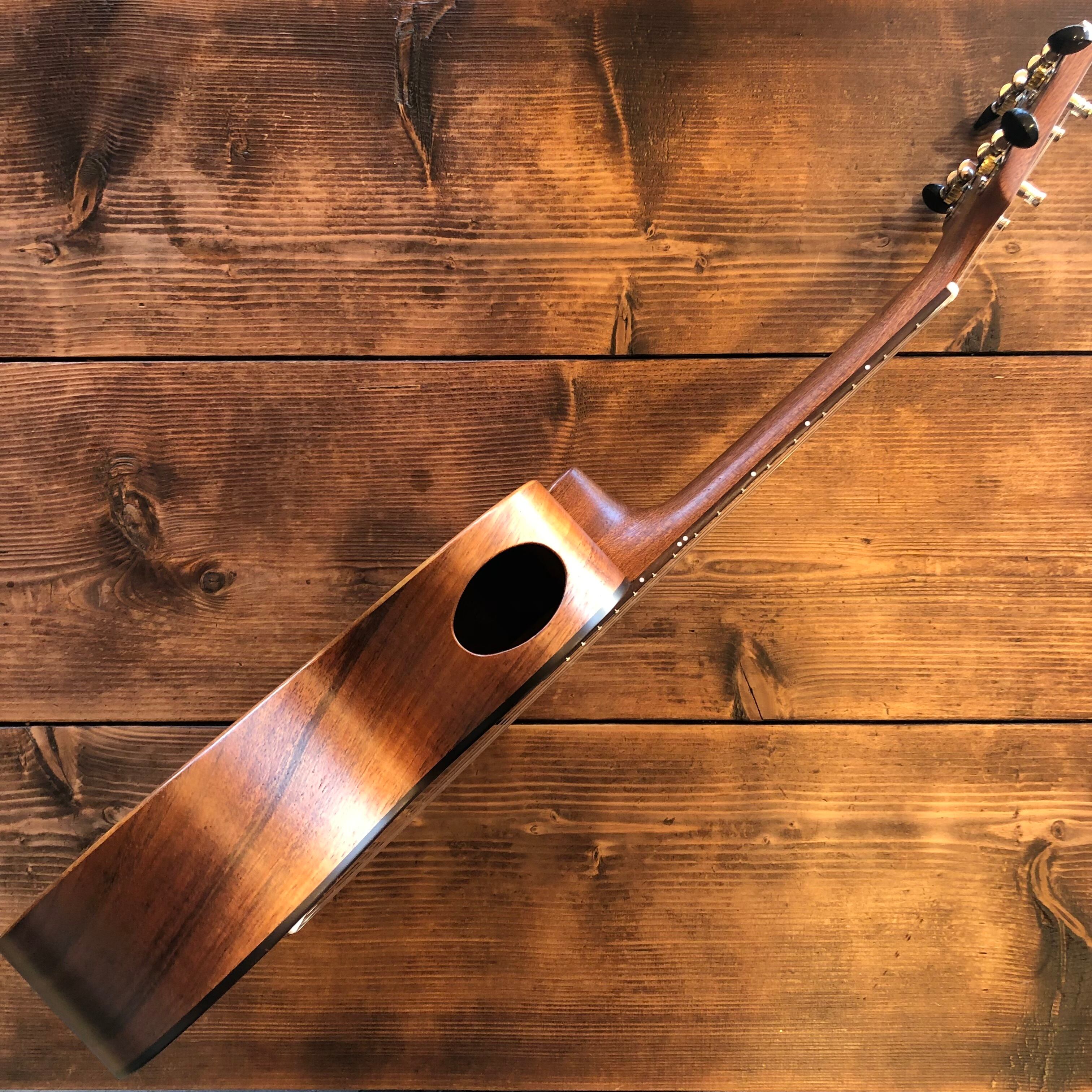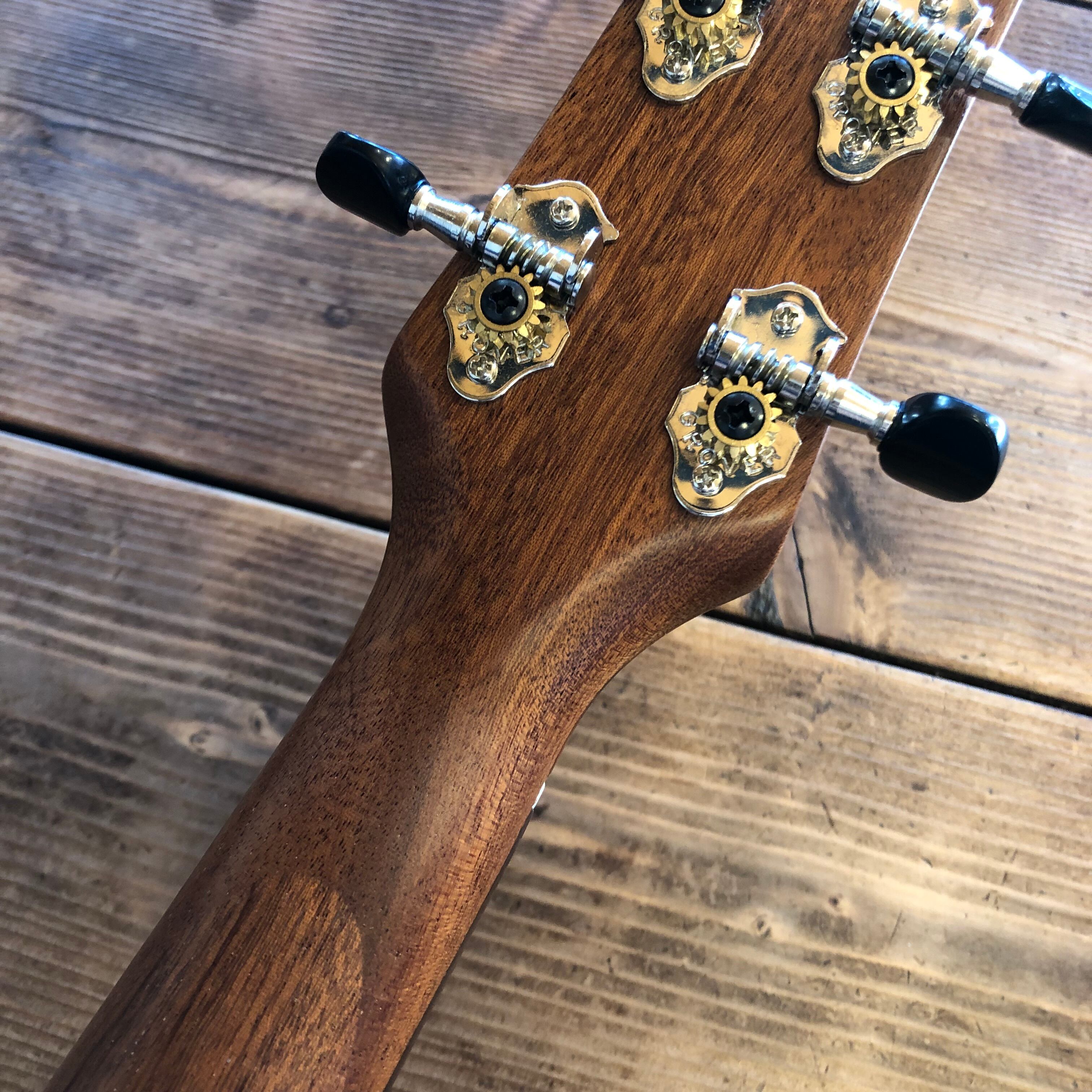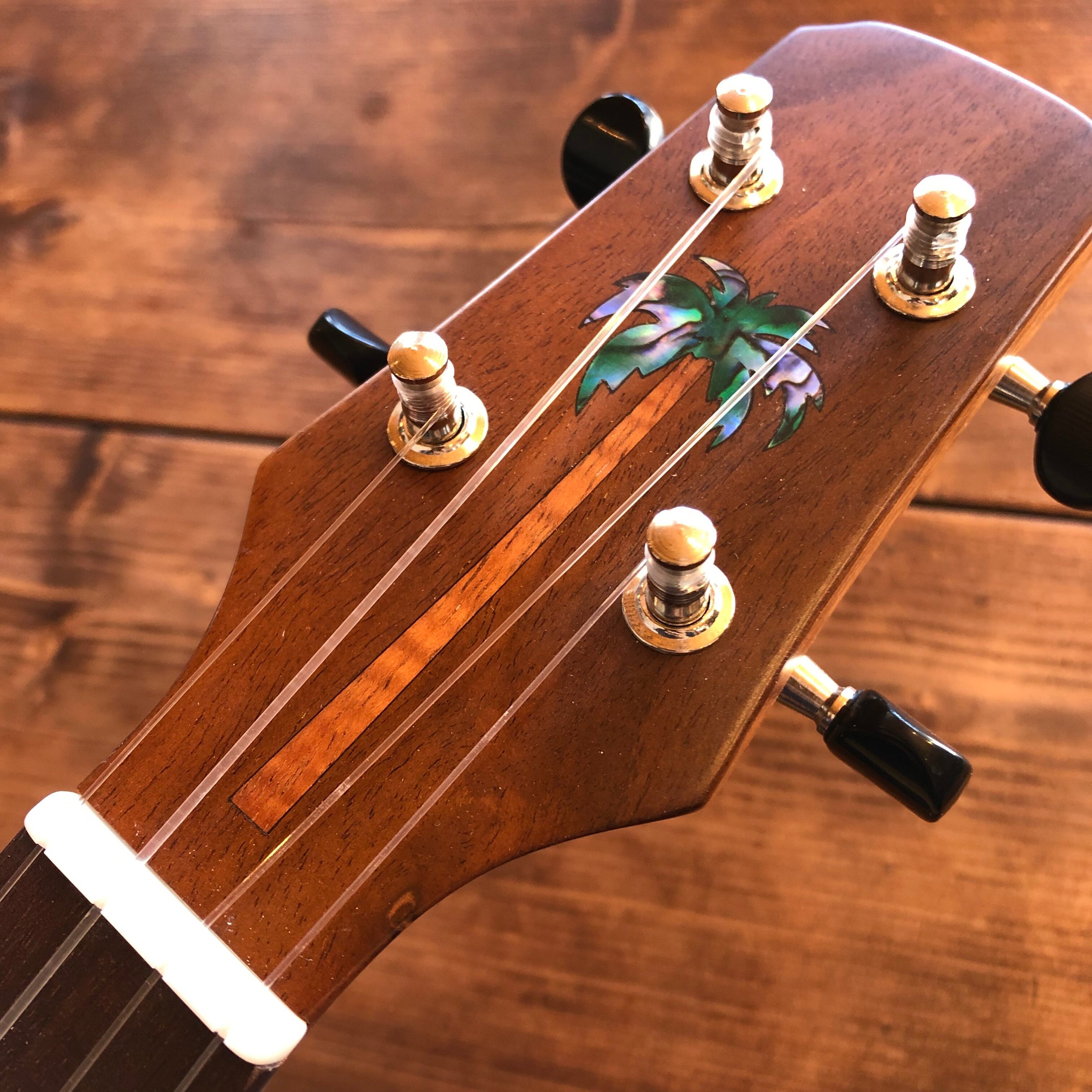 こちらは、ボディのトップ材にハワイ マウイ島のラハイナで火事になる前のマンゴー材を使用した貴重なウクレレです。ボディのサイドとバックにはハワイアンコアを、ヘッドプレートとロゼット