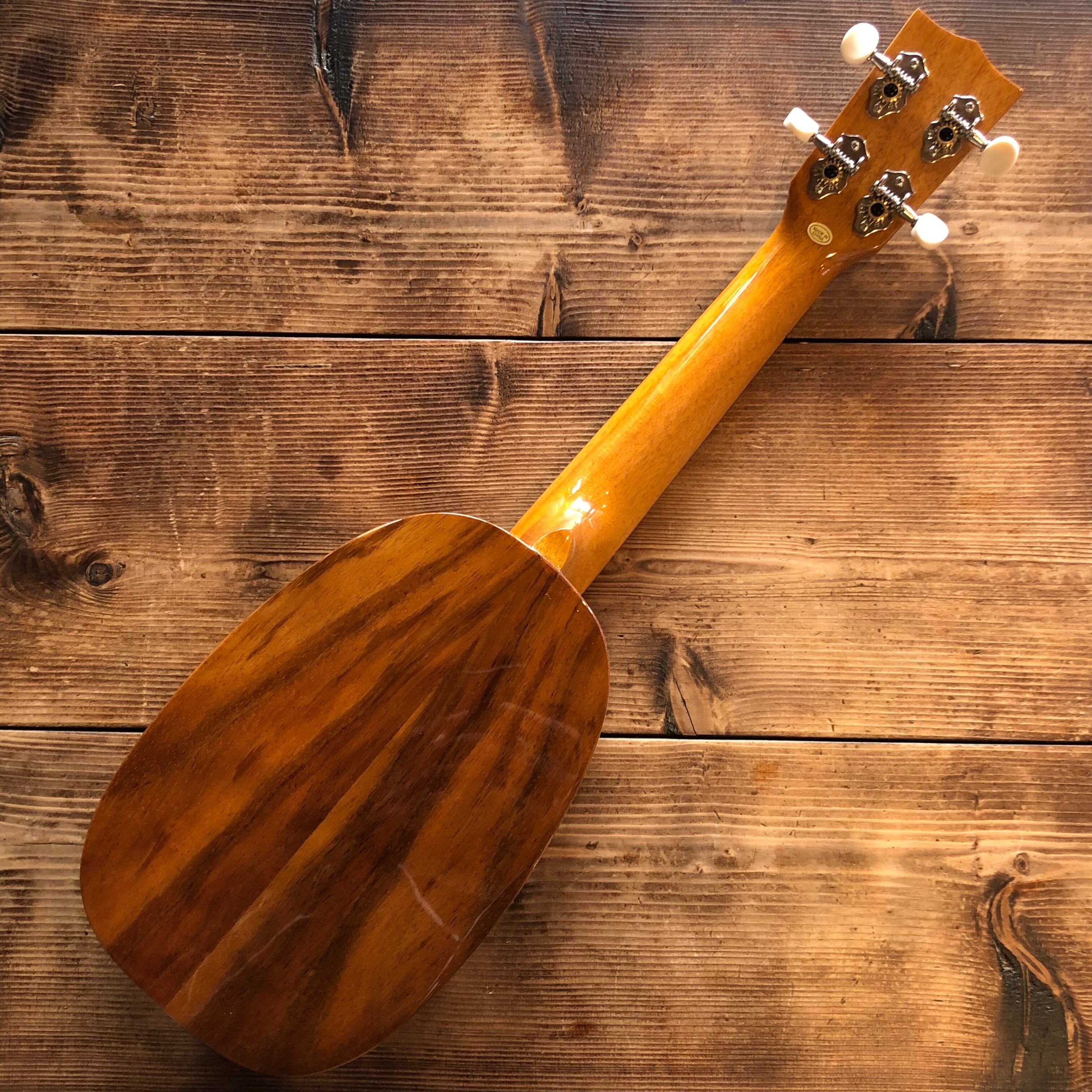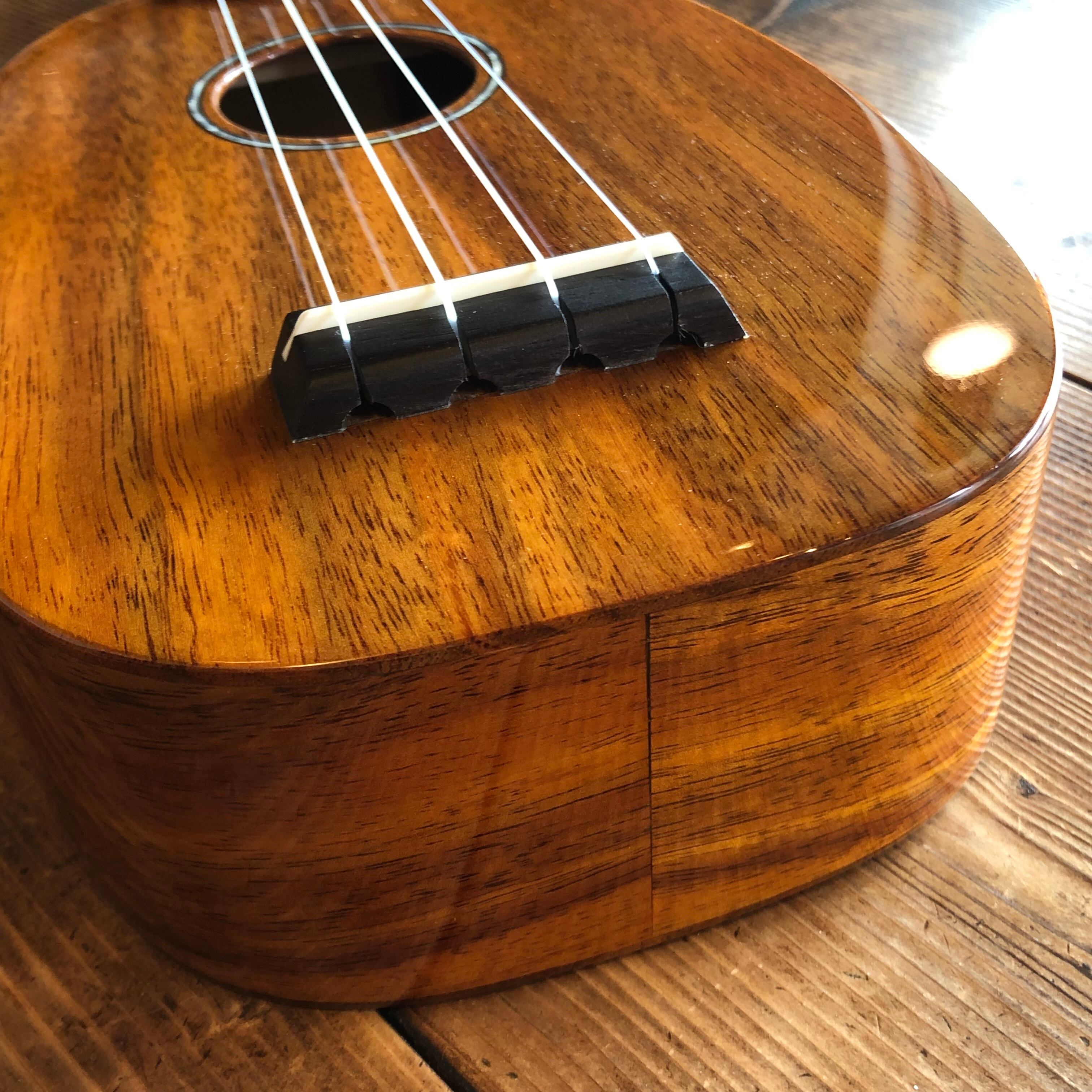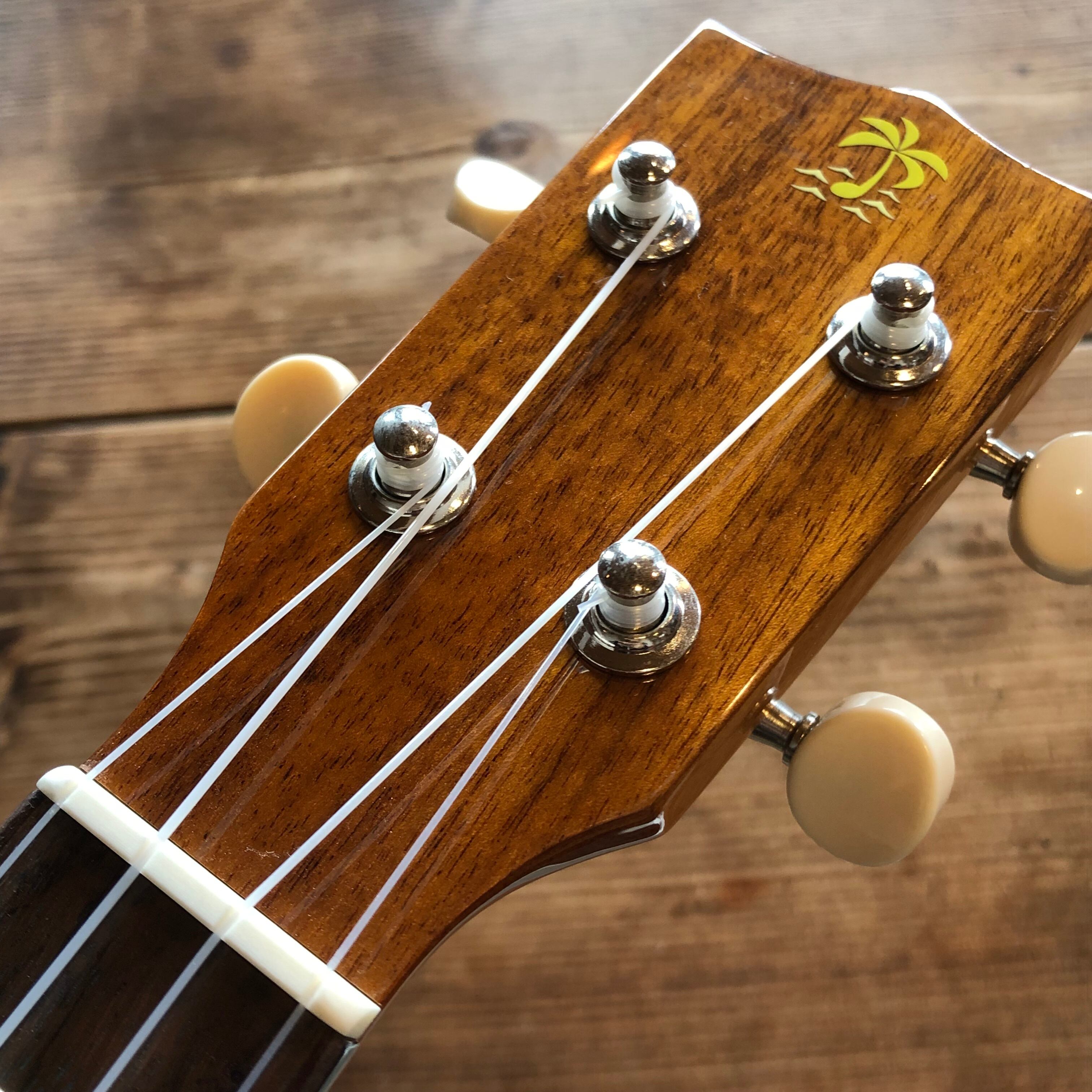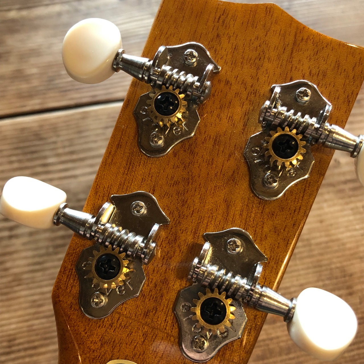 この値段で、ボディには全て本物のハワイアンコアの単板を使用し、指板の両サイドにはウッドバインディングを貼り付けており冬場の乾燥によるフレット飛び出しを防いでくれます。また、塗装は手間のかかるグロスフィニッシュ(艶有り)を採用、ペグはUSAの一流ブランドGroverのギアペグを搭載しています。(次回からのモデルにはノーブランド品のペグに変更予定ですので、これはお買い得な1本です!)
