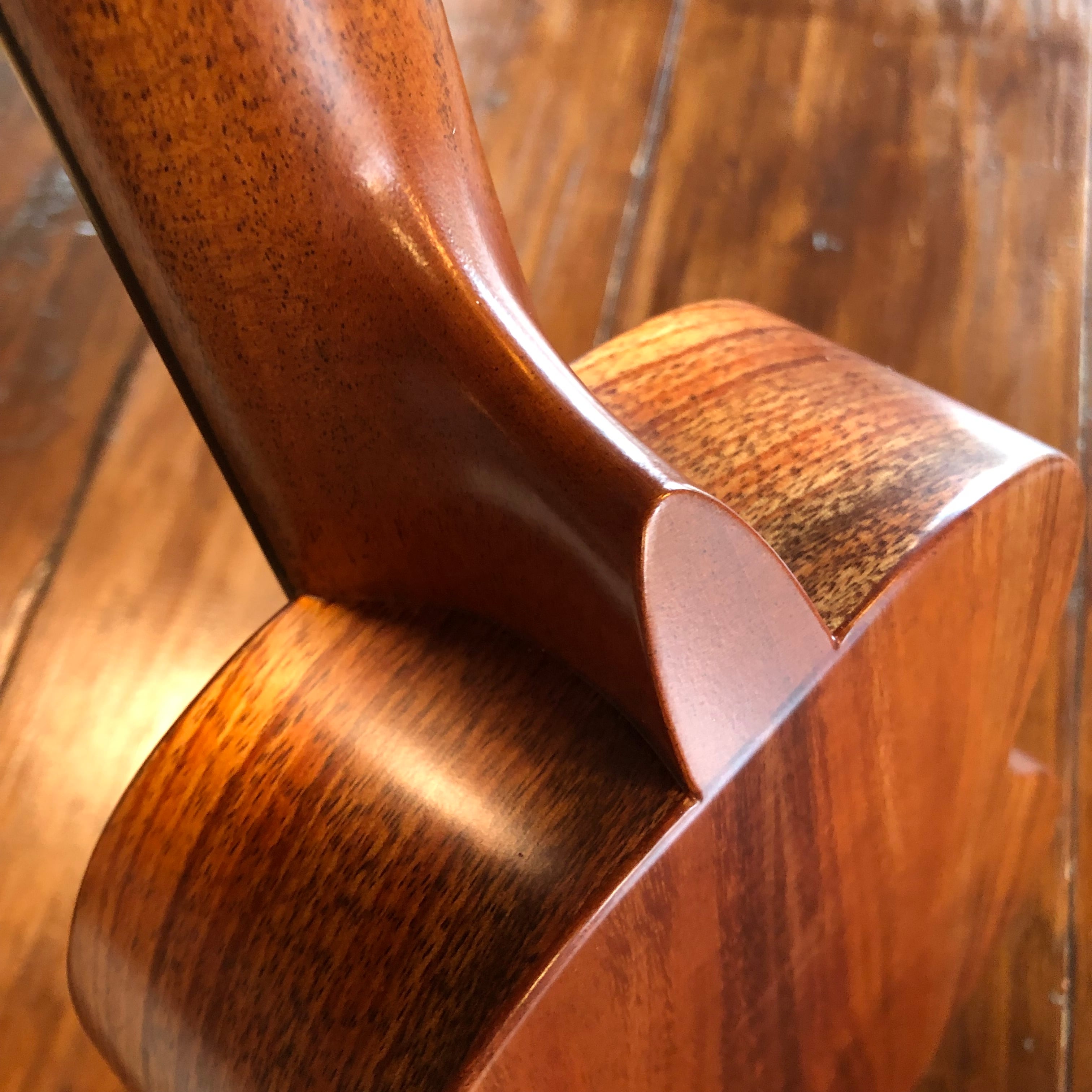 こちらは世界3大ブランドの一つ、ハワイ製コアロハのレギュラーモデルですが、衝撃によりTop板に3cmほどの割れが生じてしまった為、KoALOHA工房にて接着後にサテン仕上げに変更して製作しもらった、特殊な1本です。(通常は艶あり仕上げです)