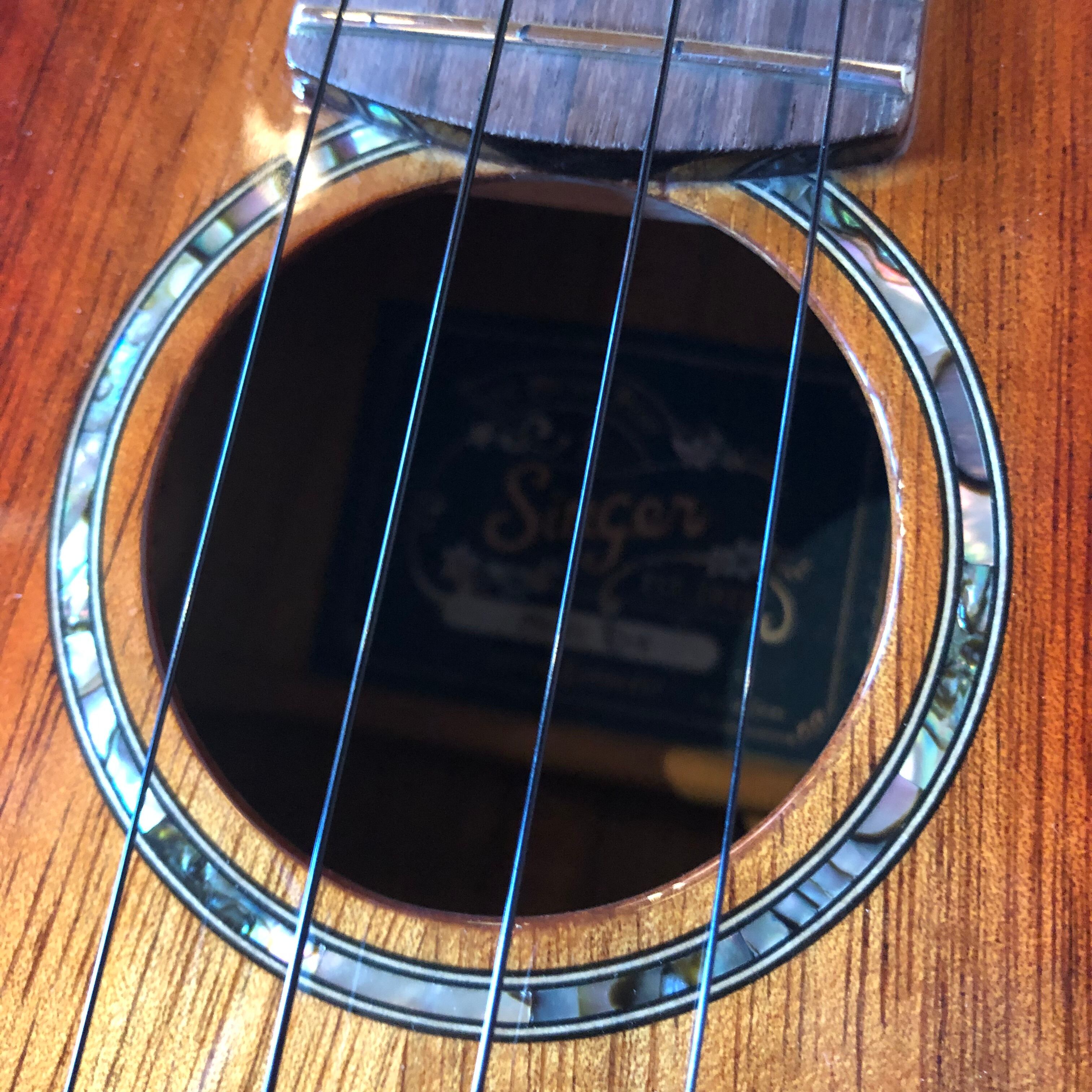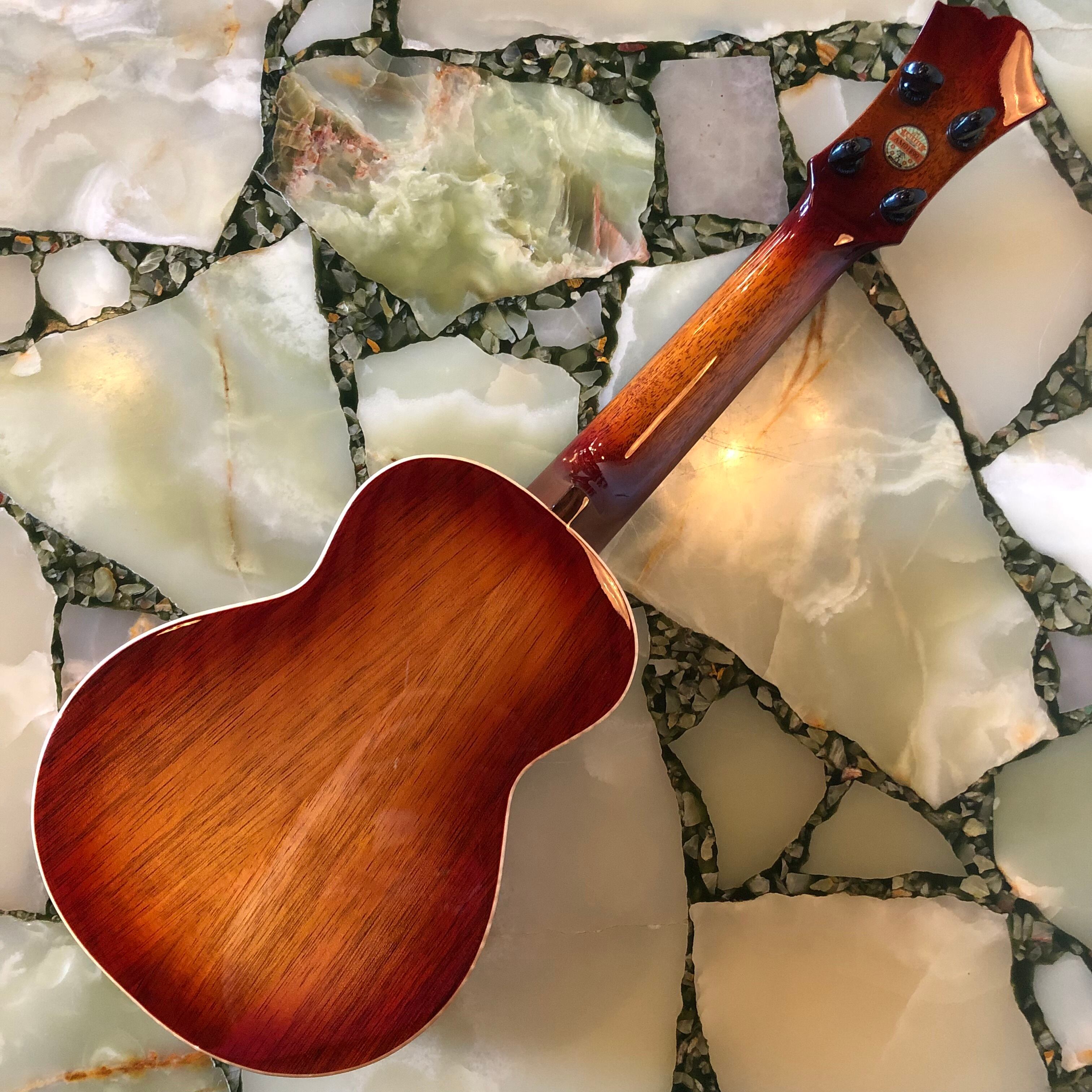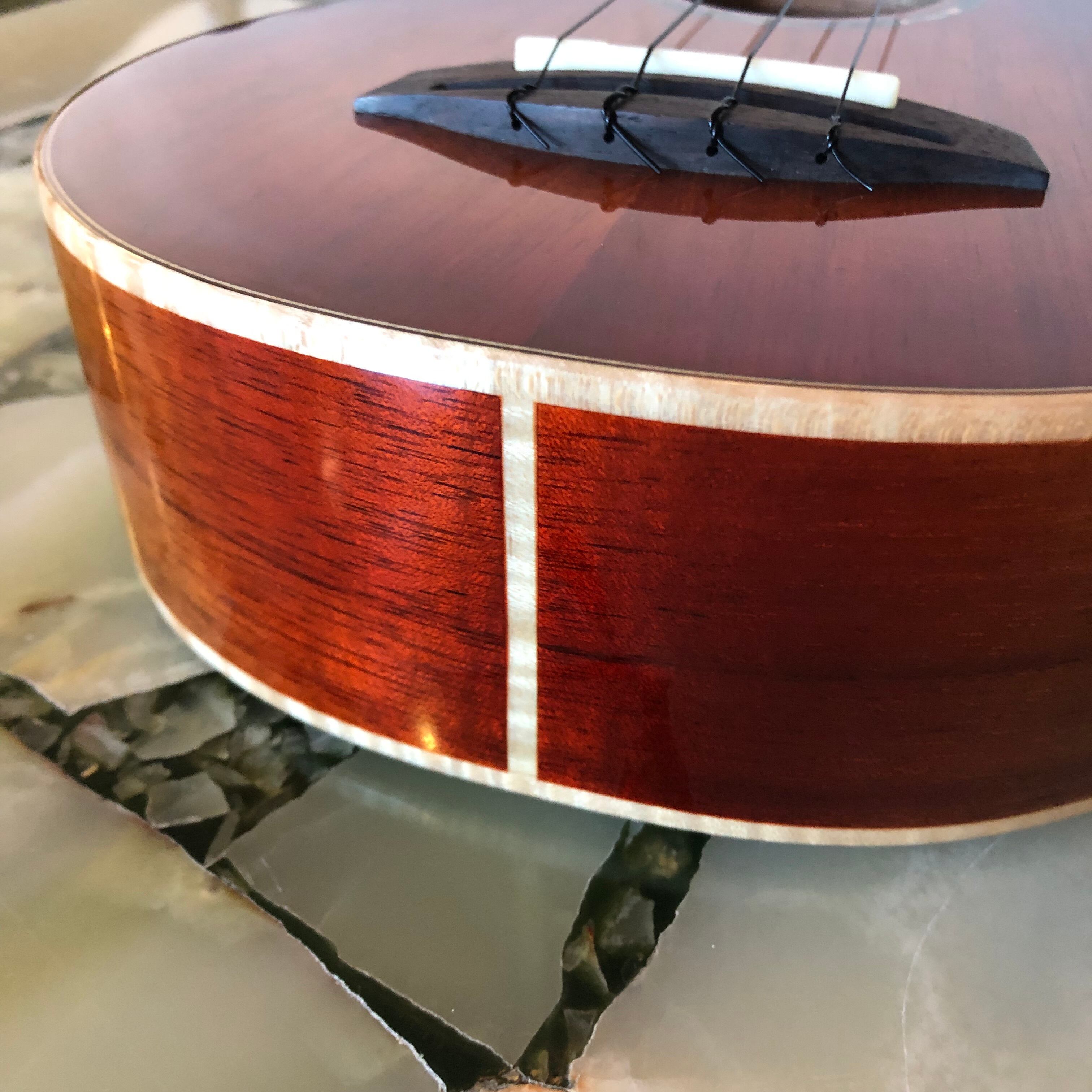 こちらはオール単板ハワイアンコアで、頑丈なファン(扇形)ブレイシングで構築されています。 ハワイアンコアは、アグレッシブなアタックに自然なコンプレッションを加え、他の木材では実現しにくいクリアな音色と甘い高音を提供します。