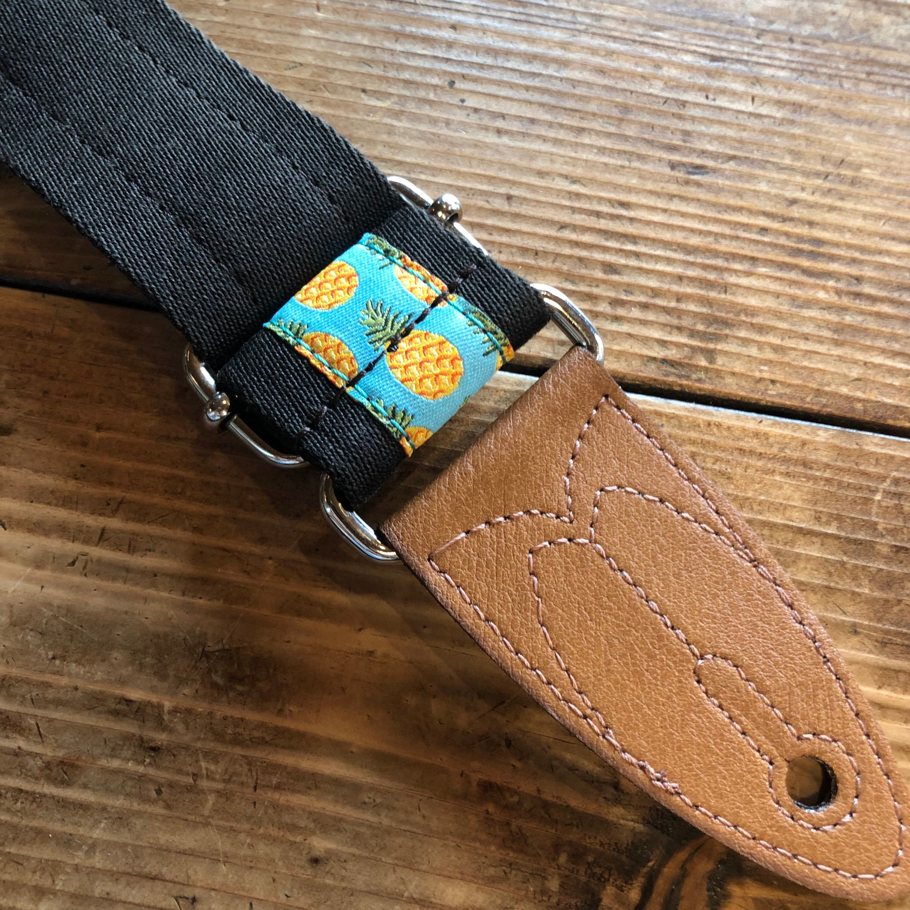 こちらは、4cm幅の自然で柔らかな質感を持った布を使用したストラップです。耐久性もテストされた物をセレクトしています。サーフボードをイメージしたエンドタブとトロピカルな印象のパターン生地を使用しウクレレにも合うデザイン。エンドタブにはSDGsに配慮した厳選されたヴィーガンレザー(合皮)を使用。85~153 センチメートル間を長さ調整可能。