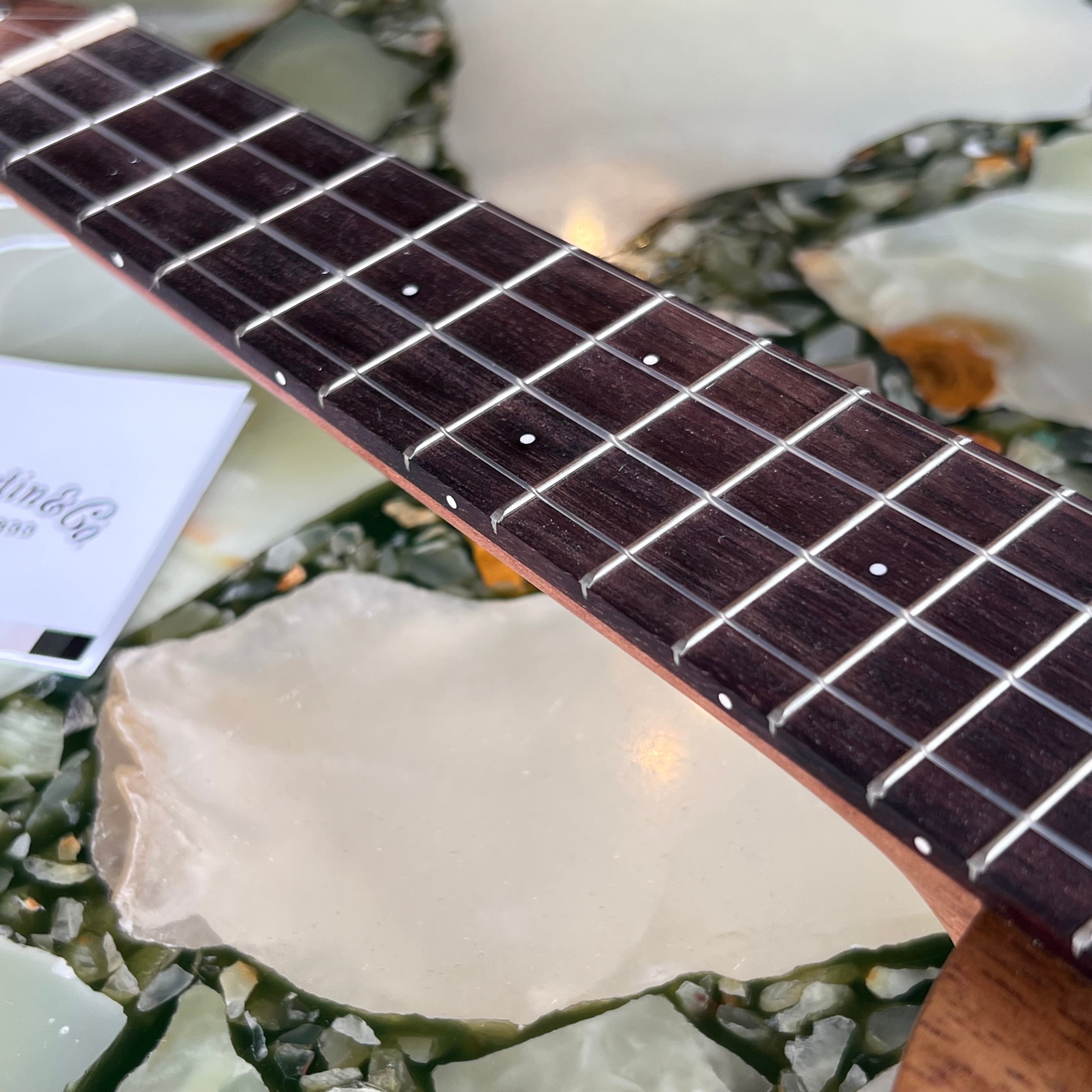 出荷前に、当店にてナット・フレット・指板・ブリッジ・サドルなどを再加工し、弦も巻き直し、音程・音の伸び・音質・演奏性・弦の耐久性・チューニングの安定度の向上を図っております。(サドルは同素材と接着剤を混ぜたもので、一部再成型してます)