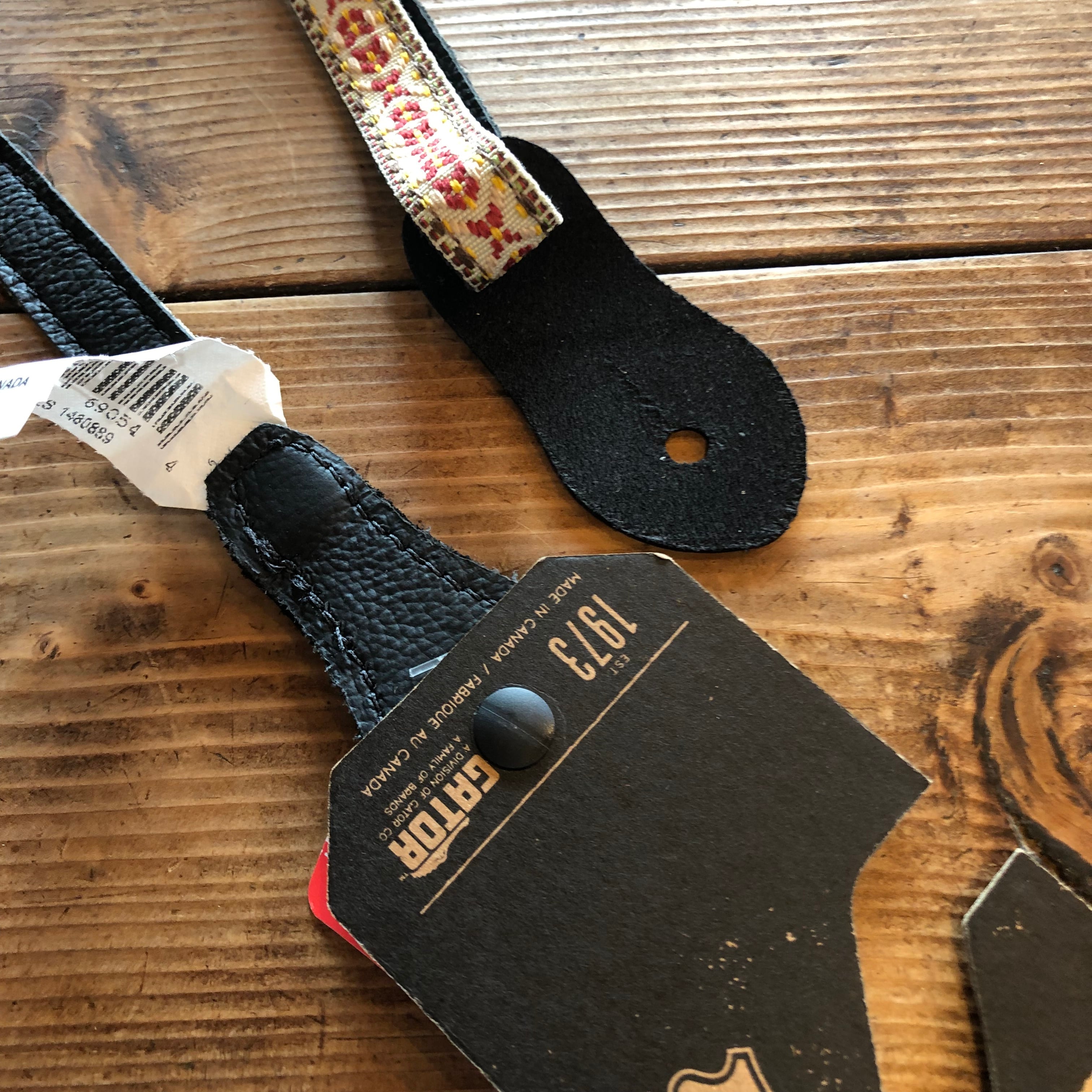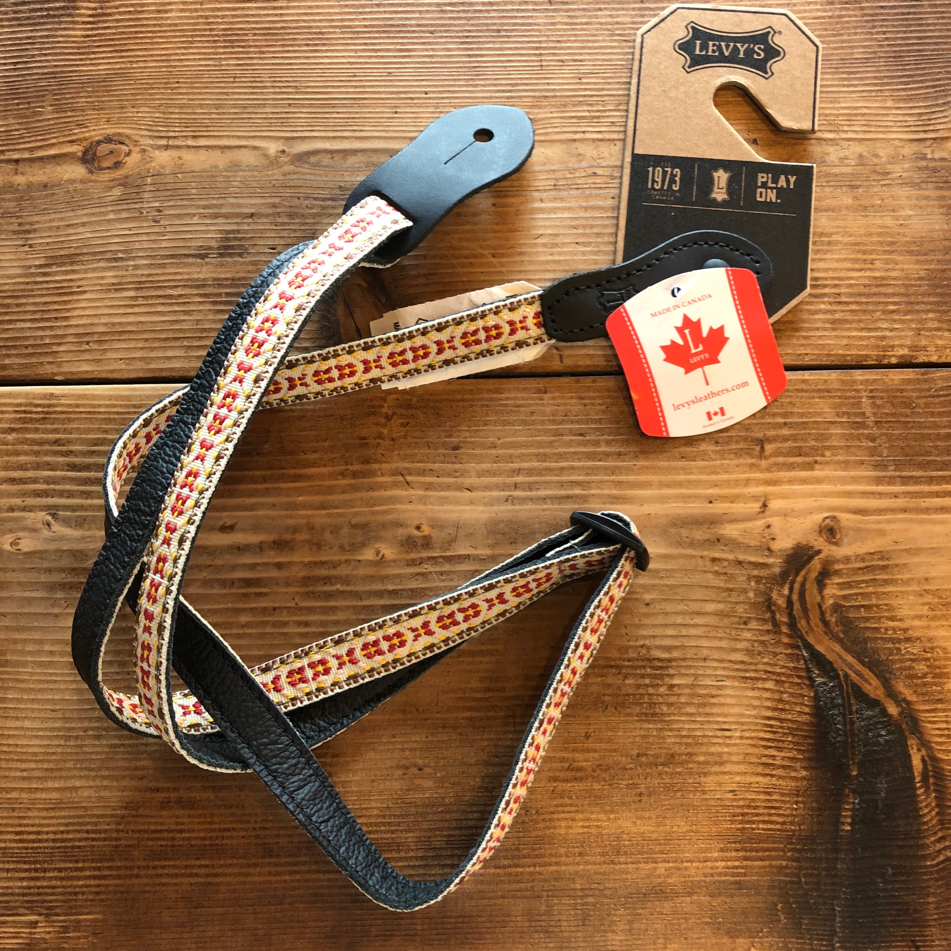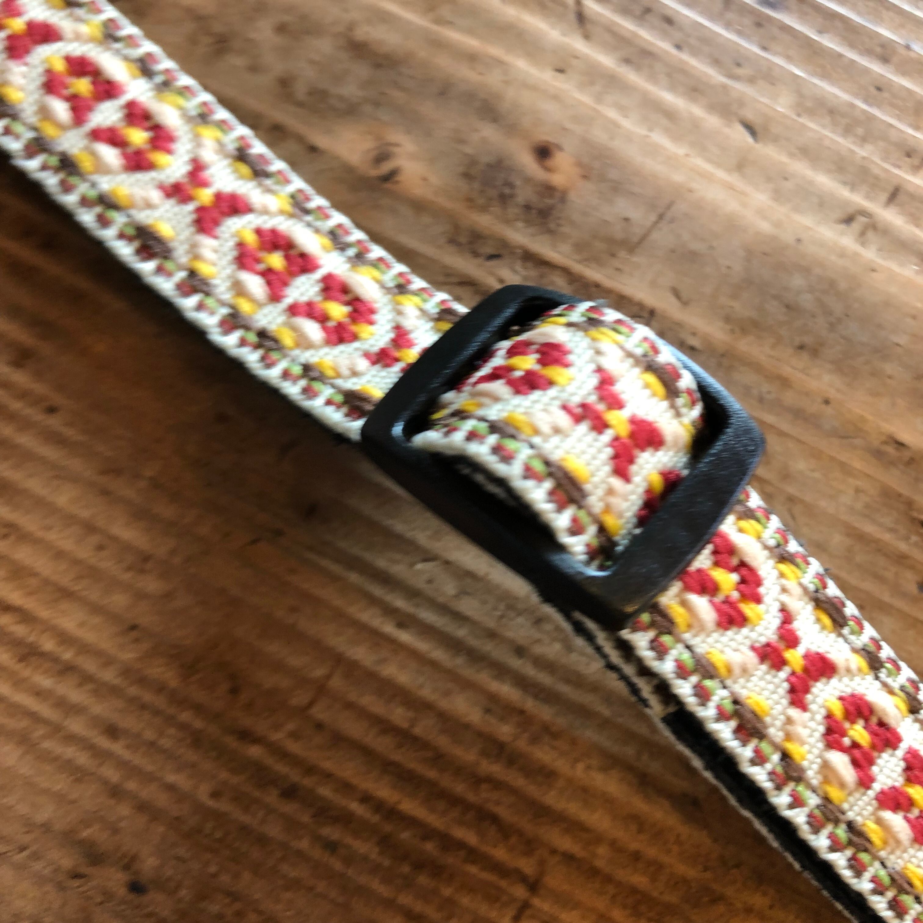 レザーのストラップピンエンド仕様のジャガード織ウクレレ、マンドリン用ストラップ。