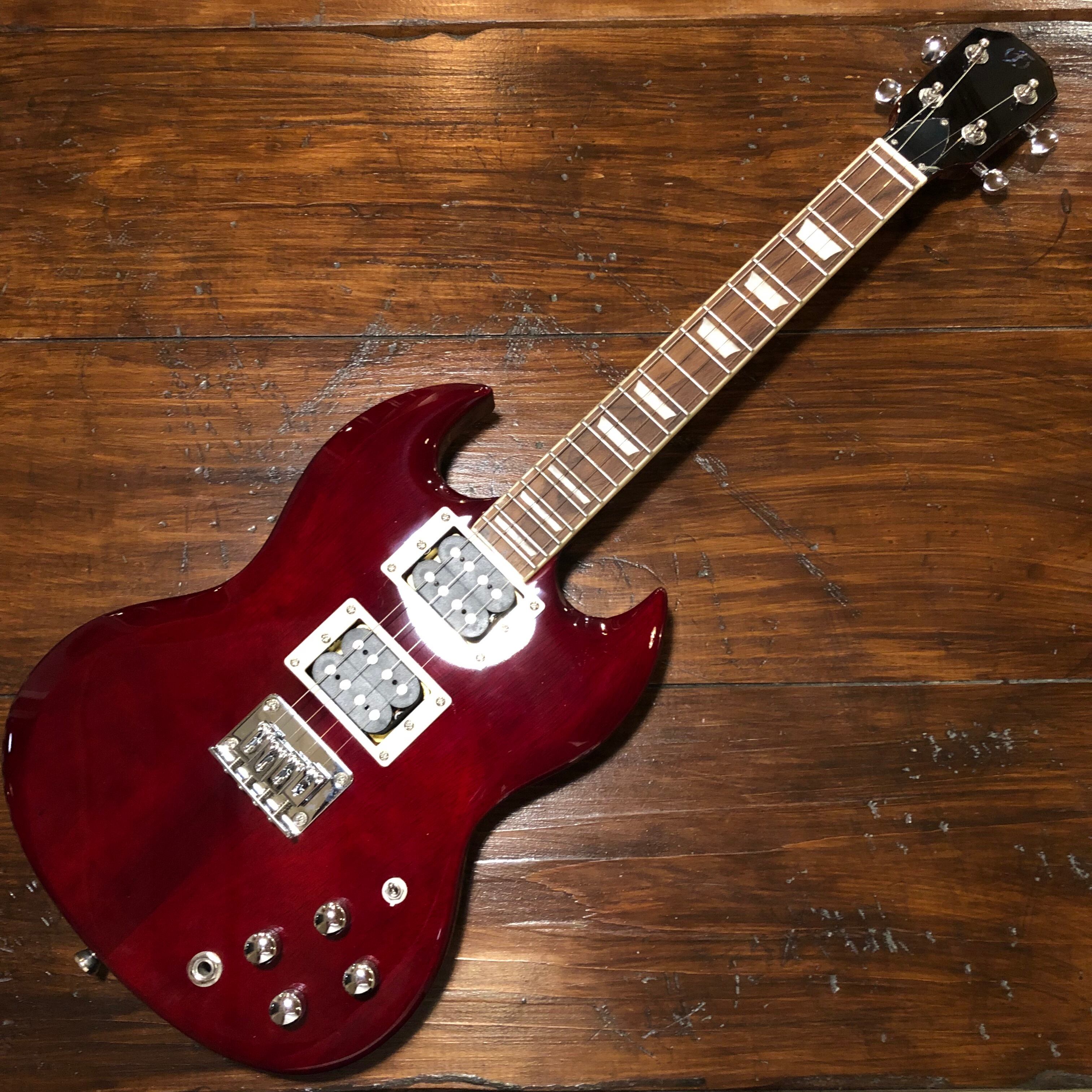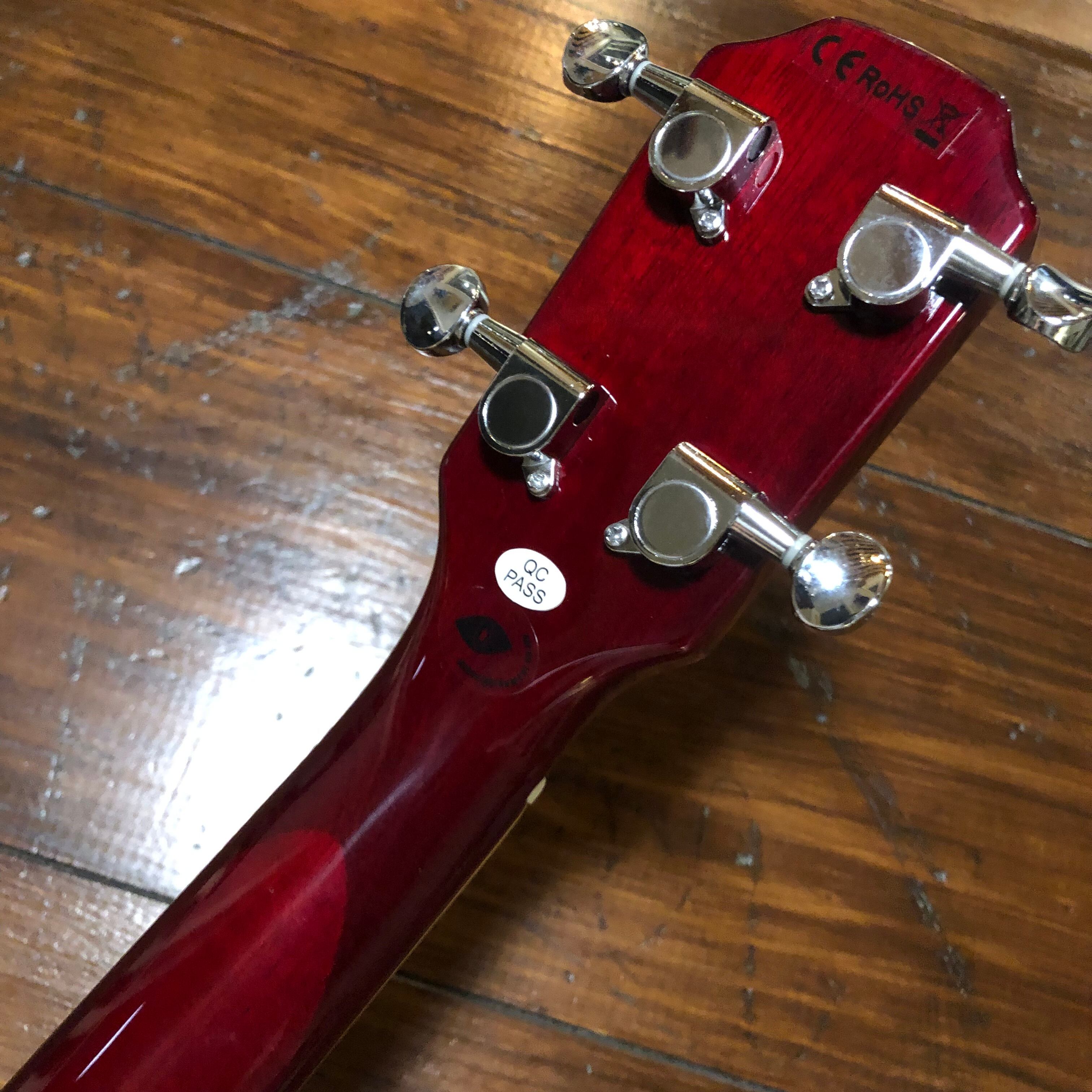 こちらはらエレキギターのシェイプを持つエレキウクレレ「Flight Rock Series」のSGタイプのギターをモチーフとしたPioneer Series。 印象的なダブルカッタウェイ、マホガニーのソリッドボディという見た目部分の仕様だけでなく、 セットネックや2ハムのピックアップ、2トーン+2ボリュームのコントロールなどひと目でみて王道と分かる仕上がりになっています。 弦はエレキギター用の1-4弦(010-026)を使用しています。