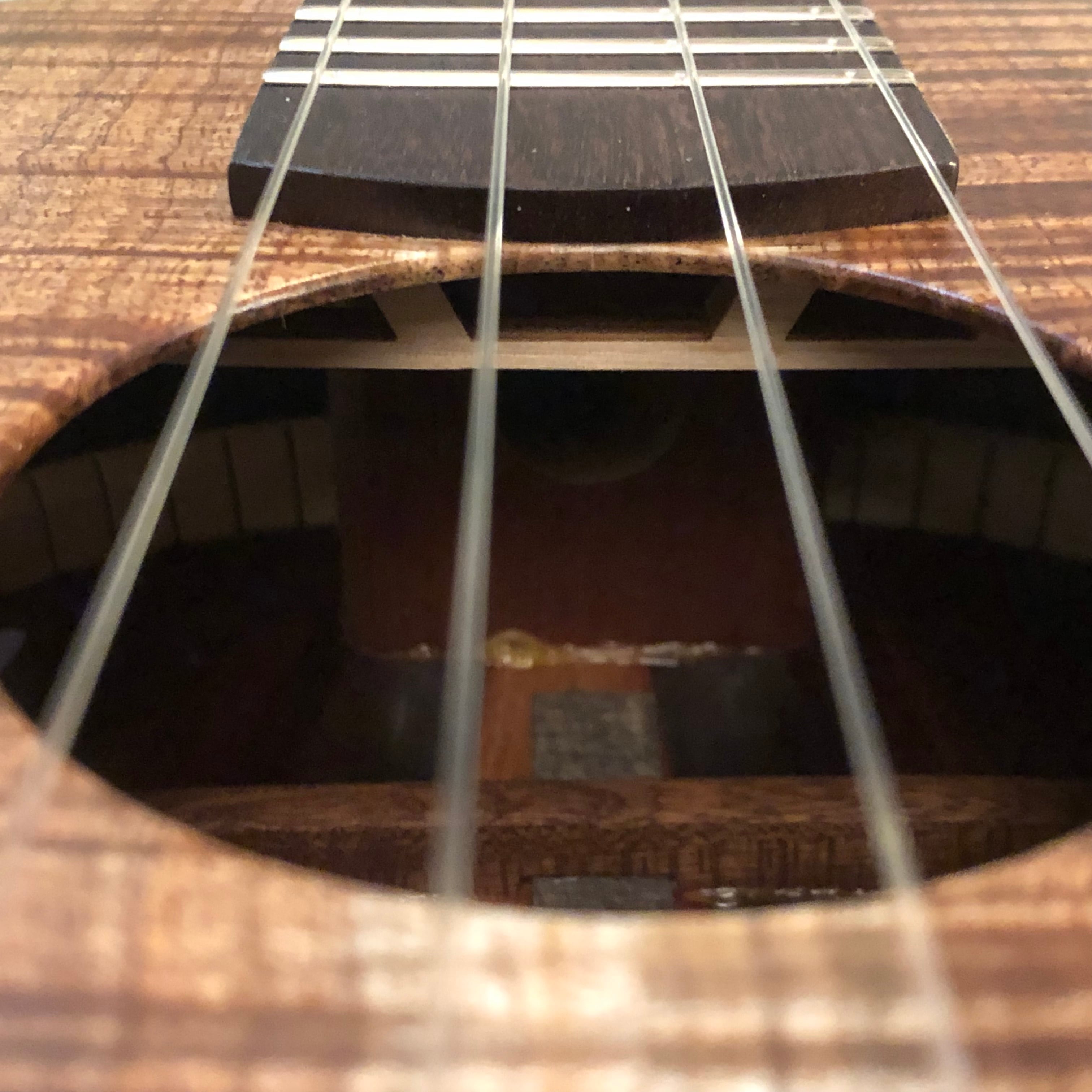 最近のモデルからは、ブレーシング(ボディ内部の補強の力木)に穴を開けることにより、サウンドと耐久性の両立を図られております。(Kanile'aなど一部の高級ブランドが採用しております。)