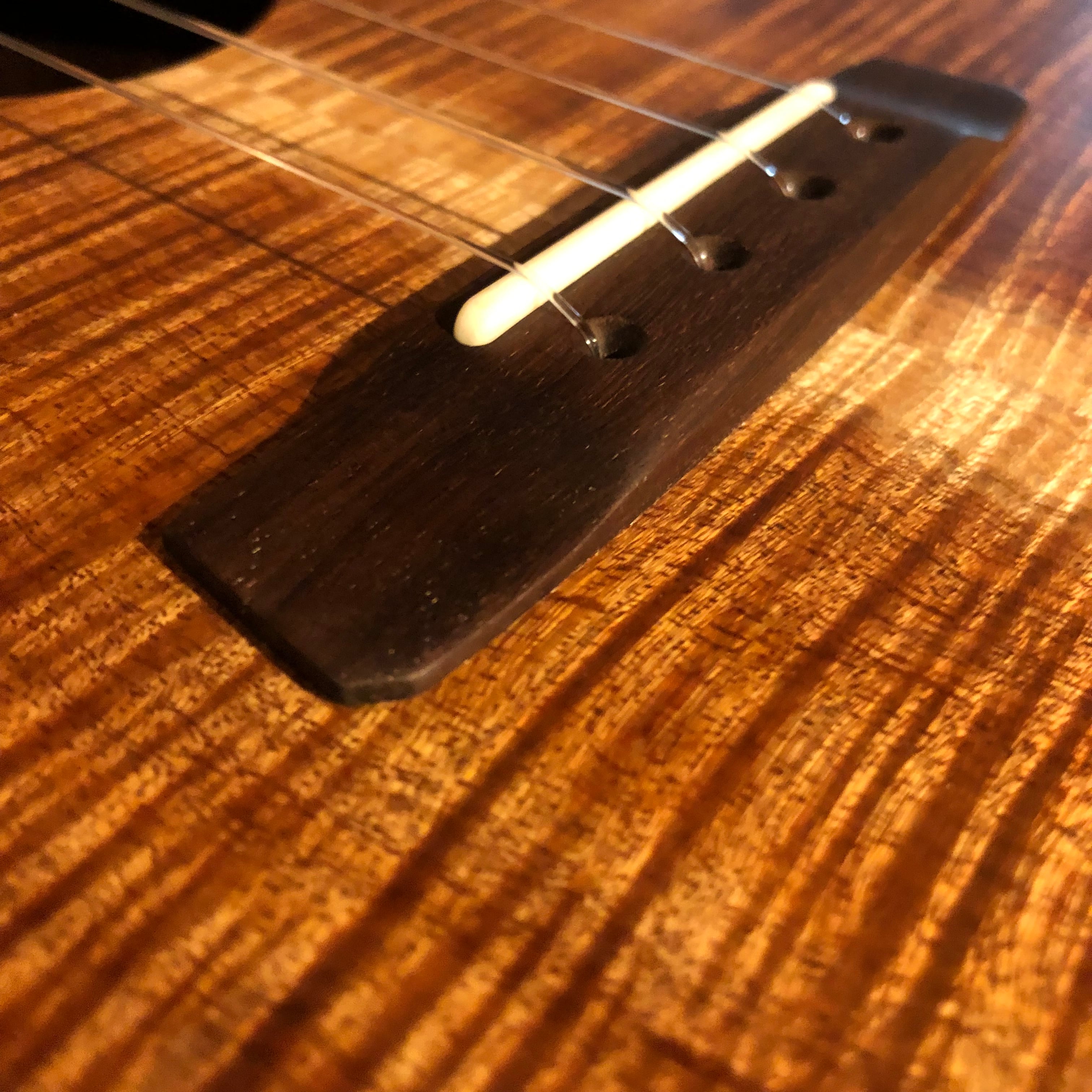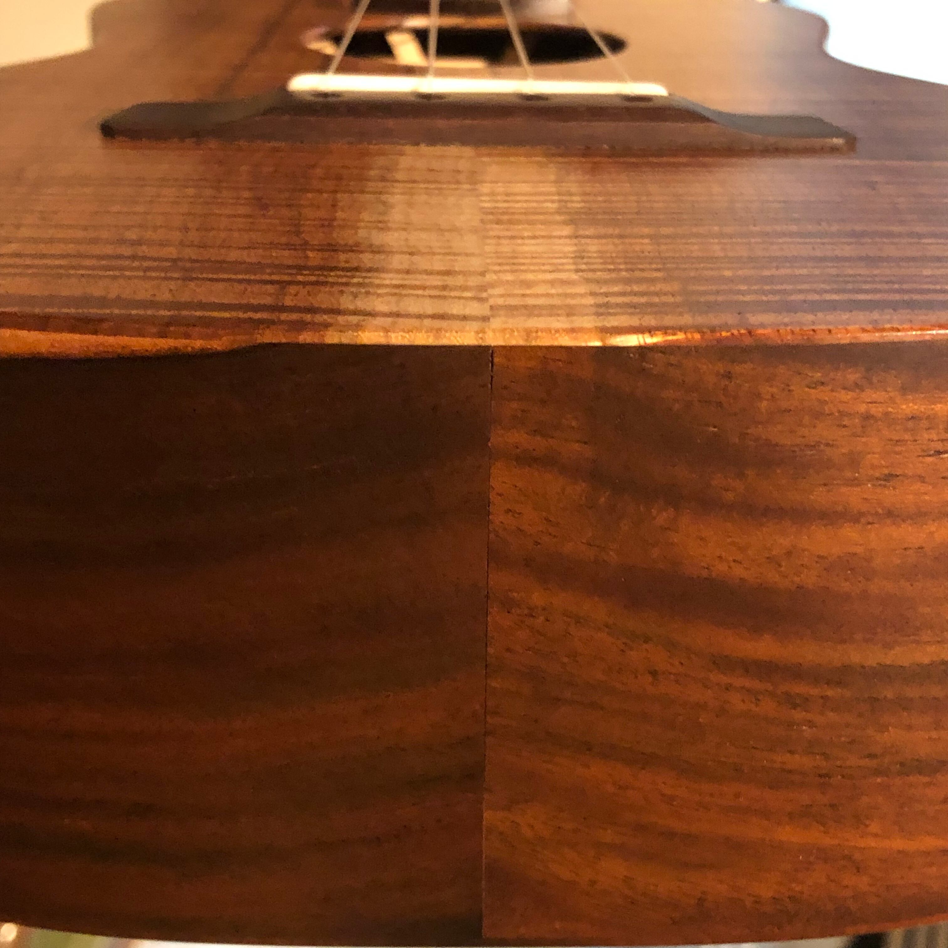 こちらは、Top材に極上のカーリーハワイアンコアを、Side&Backには近年ハワイ製高級ブランドでも人気の高いハワイの木材「ミロ」を使用しております。ミロはハワイアンコアよりもやや重く硬質な為、より引き締まった、伸びのあるサウンドとなっております。