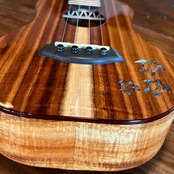 こちらは、ハワイのウミガメ【ホヌ】をあしらったアバロンインレイと、べっ甲柄のバインディングを組み合わせたコンサートウクレレです。コア材は厳格な選定、グレーディングを行ったデラックスグレードのものを使用。またアバロンインレイはボディだけでなくポジションマークにも採用されています。